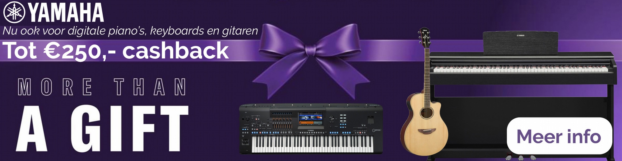 Yamaha breidt hun huidige More Than a Gift campagne uit met meer producten dan ze tot nu toe hadden aangekondigd. Bij deze selectie loopt de cashback op tot €250,-. Het gaat om digitale piano’s, keyboards en gitaren.