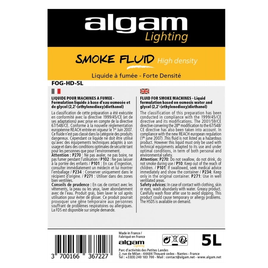 Deze rookvloeistof is voornamelijk geschikt voor de Algam Lighting rookmachines. Dit is de Heavy versie, wat betekent dat de geproduceerde rook erg dik is en lang blijft hangen. Dit zorgt voor een mysterieuze sfeer. De vloeistof wordt in Frankrijk gemaakt en voldoet aan alle veiligheidsvoorschriften van de Europese Unie. Voorkom contact met de huid, niet voor inwendig gebruik en buiten bereik van kinderen houden.
