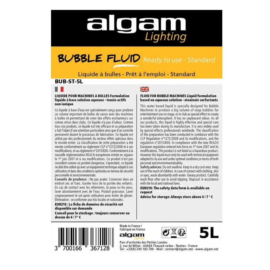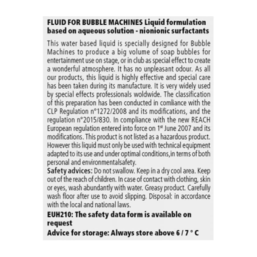 Deze bellenblaasvloeistof is geschikt voor de Algam Lighting Bubble Pro. Dit is een 5 liter jerrycan en het vloeistof is kleurloos. Bovendien is het vloeistof veilig om te gebruiken. Het wordt in Frankrijk geproduceerd en voldoet aan alle veiligheidsvoorschriften van de Europese Unie. Houdt er wel rekening mee dat het vloeistof op zeep gebaseerd is en dus erg glibberig is. Als u het vloeistof dus ergens op morst maak dit dan gelijk schoon om ongevallen te voorkomen. Voorkom contact met de huid, niet voor inwendig gebruik en buiten bereik van kinderen houden.