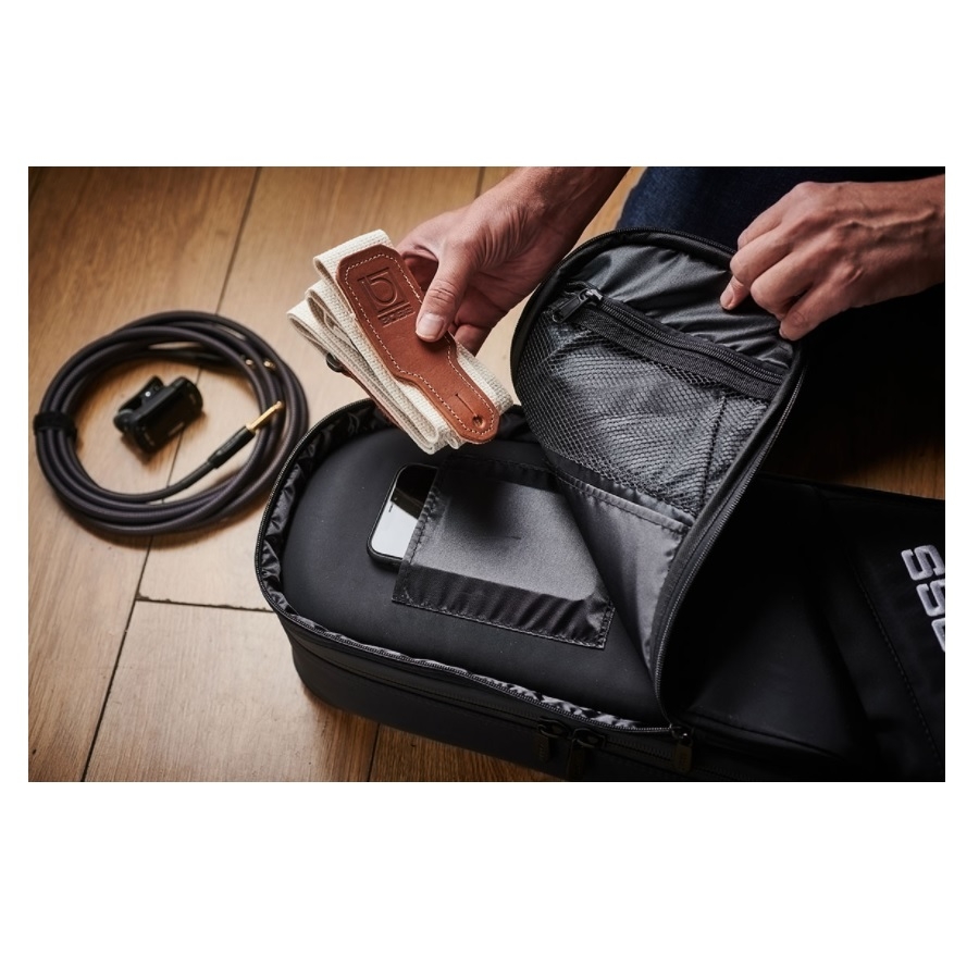 De CB-EG20 is een fijne gitaartas van Boss. Boss heeft de CB-tassen ontwikkelt om vervoer zo licht en makkelijk te maken terwijl de tas ook enorm beschermend is. De tas is erg stevig, waardoor het nog zacht en licht is als een normale tas, maar robuust genoeg om tegen een stootje te kunnen en de gitaar goed in vorm te houden. De tas heeft extra dikke padding en panelen in de voor- en achterkant. Dit lost het grootste probleem op van gitaartassen: de meeste tassen zijn erg zwak waardoor de gitaar nog steeds schade kan oplopen. De CB-EG20 heeft dit probleem niet, het is bijna net zo stevig als een koffer, maar ook net zo handig en comfortabel als een tas. De tas is op de rug te dragen of bij het handvat. Zodoende is het ook de ideale tas om mee te fietsen of te reizen. De riemen aan de achterkant zijn overigens op te bergen, waardoor deze niet in de weg zitten als ze niet gebruikt worden. De tas heeft ook twee accessoiresvakken, waardoor u niet een aparte tas hoeft mee te nemen voor bijvoorbeeld uw capo en bladmuziek. De binnenkant van de tas is van fluweel, wat erg zacht is en de lak van uw gitaar goed beschermt, en heeft twee afneembare neksteunen. De neksteunen zijn erg handig, want die voorkomen dat de hals buigt of zelfs breekt. Bovendien is de tas waterbestendig, inclusief de ritsen, waardoor het geen probleem is om met de tas door de regen te fietsen. Hoewel de tas compact en licht is, passen de meeste elektrische gitaren in de tas. Kortom, de CB-EG20 is een koffer in de vorm van een tas!