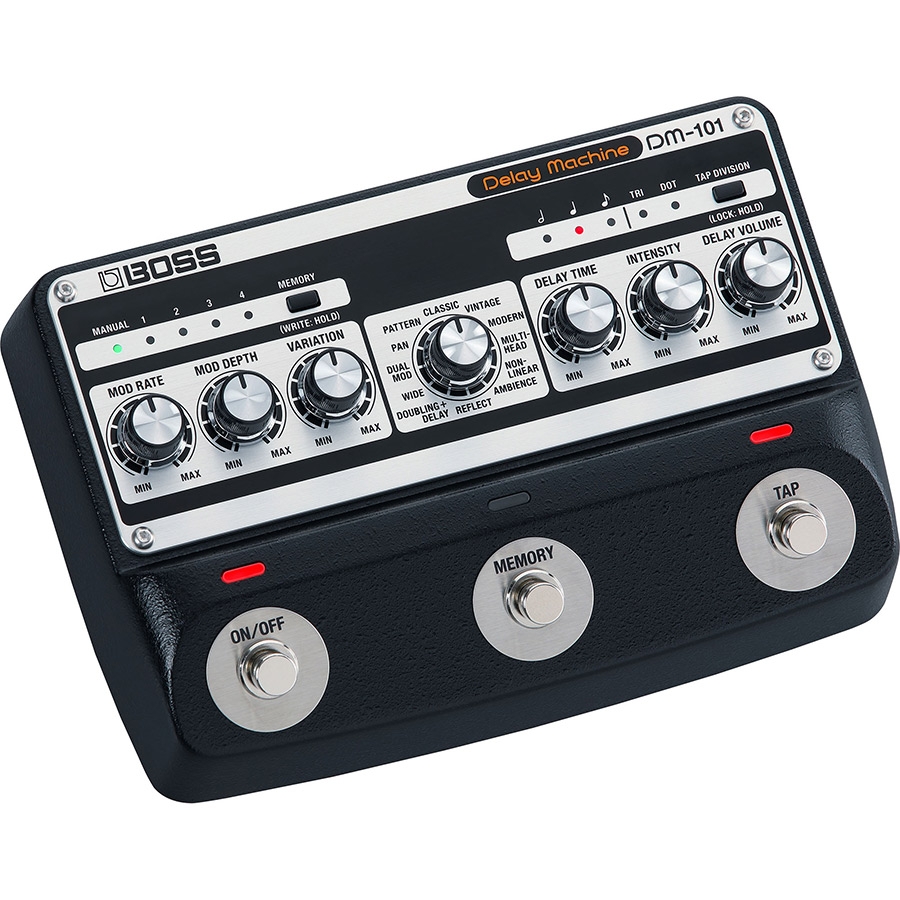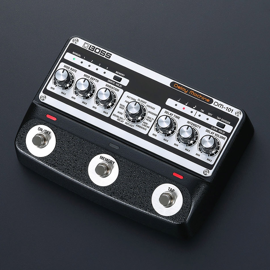 De Boss DM-101 is een delay pedaal wat digitale functies combineert met een volledig analoog circuit. Dit circuit bestaat uit 8 zogenaamde BBD audio circuits dat veel gebruikt werd bij delay pedalen in de jaren '70 en '80. Boss combineert deze vintage techniek met een slimme digitale CPU waardoor je de klank van vintage pedaal kan combineren met de mogelijkheden van de 21e eeuw!