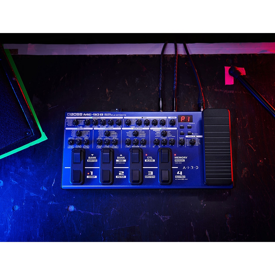 Boss heeft de ME-90B 61 verschillende effecten speciaal voor de basgitaar gegeven, en ze zijn zoals we van Boss verwachten van hele hoge kwaliteit! Deze effecten zijn onder andere overdrives, distortions, modulaties, delays, reverbs en nog veel meer! Om de bediening simpel te houden heeft Boss gekozen voor alleen draaiknoppen, en een klein scherm voor getallen. De effecten bedien je allemaal via 6 verschillende footswitches. Per footswitch gedeelte kan je kiezen uit veel verschillende effecten. Elke footswitch is een andere categorie: Preamp/EQ, Comp/filter, Filter/FX2, Drive/Synth, Modulatie en Delay/Reverb. Kortom: Een supersimpele bediening!