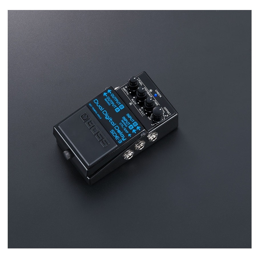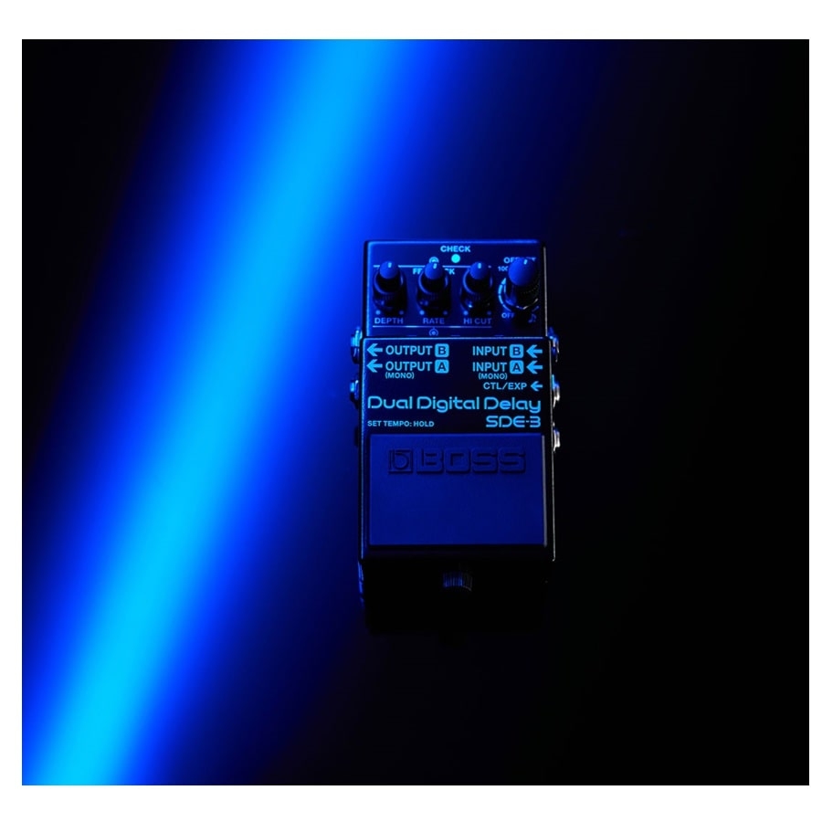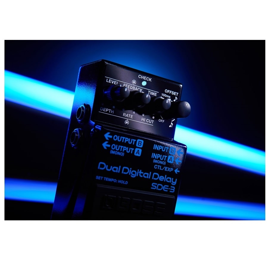 De SDE-3 is een hoogwaardig nieuw delay pedaal van Boss. Boss is een Japans bedrijf wat voornamelijk bekend staat om hun wereldwijd populaire gitaarpedaaltjes. Dit is bij de SDE-3 ook duidelijk gezien deze geïnspireerd is op de iconische SDE-3000 van Roland (Boss’ moederbedrijf) wat bekend staat om zijn iconische jaren ’80 geluid wat door vele legendarische gitaristen toentertijd werd gebruikt. Het pedaal is echter tijdloos. Het systeem mag dan authentieke historische geluiden bevatten, maar het systeem heeft ook moderne geluiden en functies. Zodoende is het pedaal zeer veelzijdig. De SDE-3 kan afgesteld worden met de vier draaiknoppen: de Level knop, de Feedback knop, de Time knop en de opmerkelijke Offset knop. Met de Offset knop kunt u kiezen tussen allerlei soorten delay texturen en zo een unieke kleur aan uw geluid toevoegen. Bovendien kunt u kiezen tussen verschillende soorten output: stereo, wet/dry en dry mute.