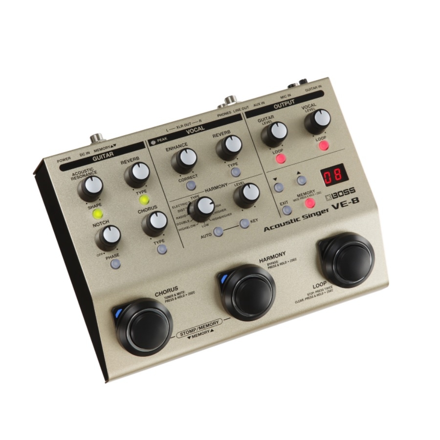 De VE-8 is een pedaalsysteem voor de zanger en gitarist die akoestische gitaar speelt. Het pedaal heeft de mogelijkheid om uw stem aan te passen. Zo kan u ook uw stem verbeteren, reverb toevoegen, meerdere soorten harmonieën toevoegen, en het level, hoeveel u van de vervorming wilt, aanpassen. Zodoende kan u dus de toonhoogte zelfs aanpassen, en zorgen dat u zuiver blijft zingen. Bovendien kan u uw zang voller maken door harmonieën aan te zetten. Er is ook een mogelijkheid vervorming en effecten toe te voegen aan uw stem.