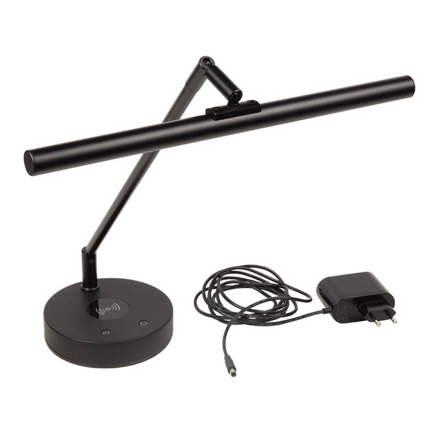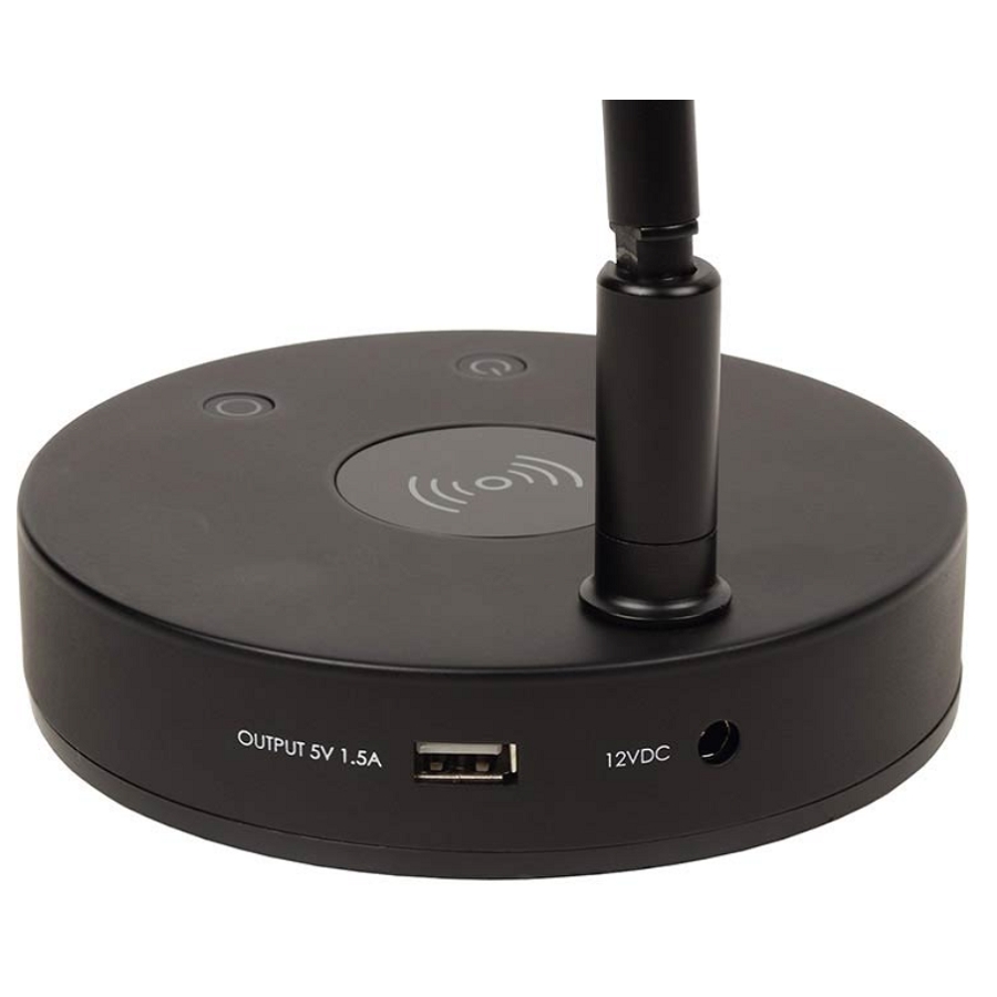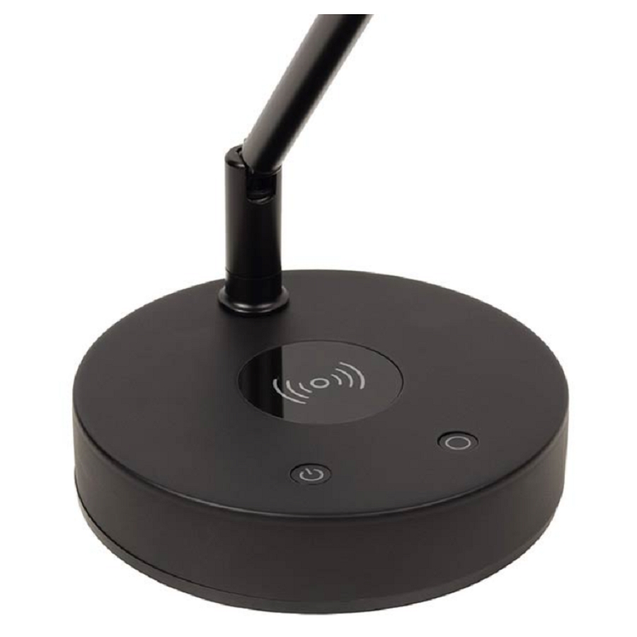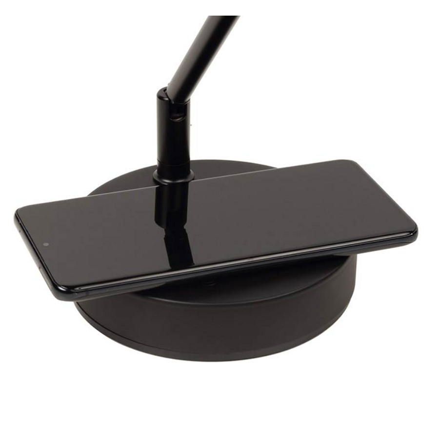 De lamp wordt van stroom voorzien middels de meegeleverde adapter maar functioneert ook via een USB-oplaadpoort. Leuk extra details is dat het mogelijk is om draadloos een smartphone op te laden op de voet van de lamp.