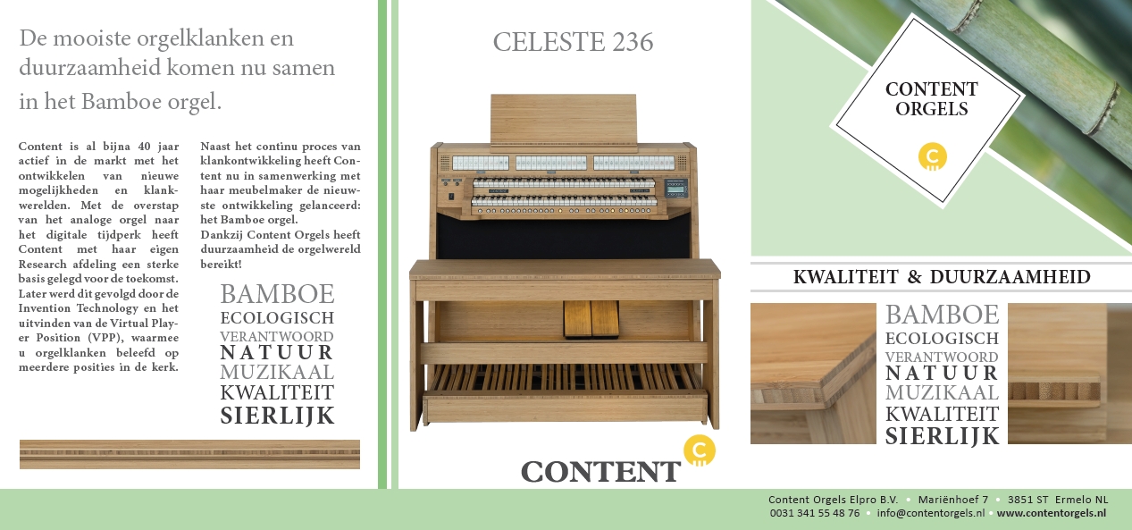 In de hedendaagse maatschappij komen begrippen zoals ecologisch, duurzaamheid en milieubewust steeds vaker voor. Toonaangevend orgelfabrikant Content komt als eerste orgelfabrikant met een duurzaam orgel op de markt. De Content Celeste 236 Bamboe combineert muzikaliteit, sierlijkheid en kwaliteit met de natuur, duurzaamheid en ecologie.