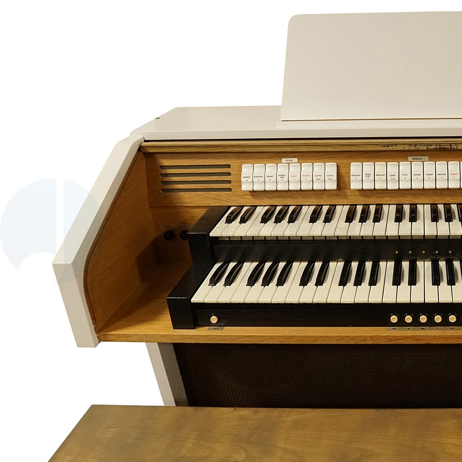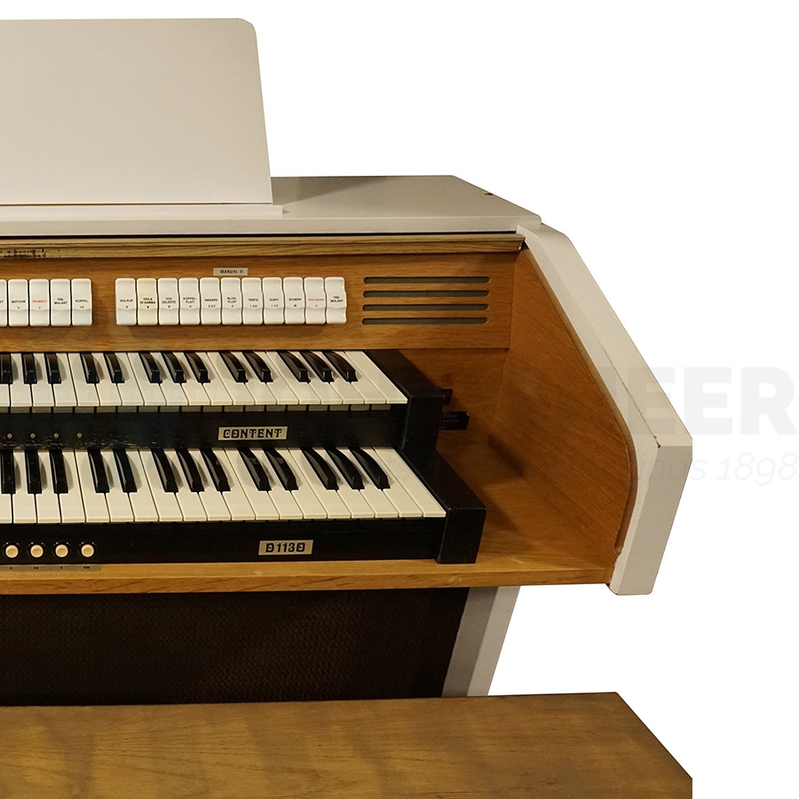 De Content D1130 is een tweeklaviers orgel van Hollandse makelij. Content instrumenten staan al jarenlang bekend om hun degelijkheid, betrouwbaarheid en mooie klank. Hoewel dit model al ietwat gedateerd is, is de kwaliteit nog als vanouds; te danken aan de hoge kwaliteit speakers en versterkers die Content toen al gebruikte. Onder de klavieren vindt u namelijk al een stel forse basspeakers en versterkers vanbinnen; maar dit model is daarnaast zelfs nog uitgerust met extra hogetonen speakers aan weerszijden van de registers!