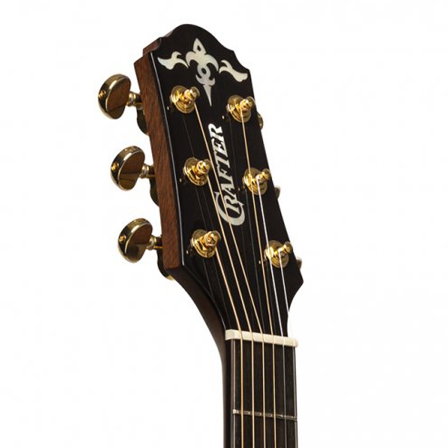 Alle high-end modellen van het merk Crafter worden uitgerust met de beste houtsoorten. Deze G-1000CE is daar geen uitzondering in. De massieve Engelmann sparrenhouten top en massieve palissander zij- en achterkant laten de gitaar echt zingen. Het klankkarakter van Crafter beschrijft zich het beste als warm en detailvol. Ook als u erg houdt van de snaren heel hard aanslaan zal deze Crafter zijn detail behouden. De afwerking van de klankkast is glossy, maar de mahoniehouten nek is mat afgewerkt. Dit zorgt voor een soepele speelervaring, en minder vlekken na het spelen. De toetsen zijn daarnaast van palissander. Een compleet plaatje is de Crafter tot nu toe dus wel, maar hoe zit het met de preamp? Ook dat zit goed, dankzij het gebruik van de L.R. Baggs Element, die overal ter wereld wordt gezien als de industriestandaard. Daarnaast is de versiering op de top en de toetsen erg spectaculair te noemen. De twee vogeltjes, plus de bloemen maken dit een prachtige gitaar die zeker zal opvallen op het podium. Ook krijgt u bij deze gitaar een prachtige gigbag. Kortom: De Crafter G-1000CE is een compleet pakket voor iedereen die op zoek is naar een serieuze gitaar, met een warme klank.