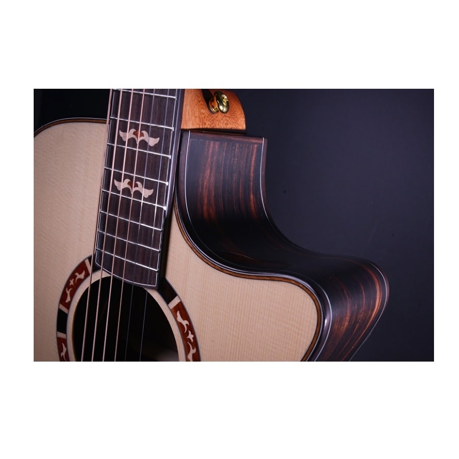 De STG G-22CE Pro is een grand auditorium gitaar. Dit is een model wat een slag groter is dan de orchestra. Vanwege de vorm van de gitaar is deze ideaal voor tokkelen en de grootte van de klankkast zorgt ervoor dat de projectie op die van een dreadnought lijkt, waardoor deze ook zeer geschikt is voor slaggitaar. Het bovenblad van de klankkast is van Engelmann sparrenhout gemaakt, wat voor een fijn warm geluid zorgt. De achter- en zijkanten zijn van macassar gemaakt. Macassar is een duurzamer alternatief voor ebbenhout en heeft een dynamische respons met een luid volume. De hals is van mahoniehout gemaakt en de toets van palissander. Dit is een populaire combinatie dat voor een geweldige speelervaring zorgt.