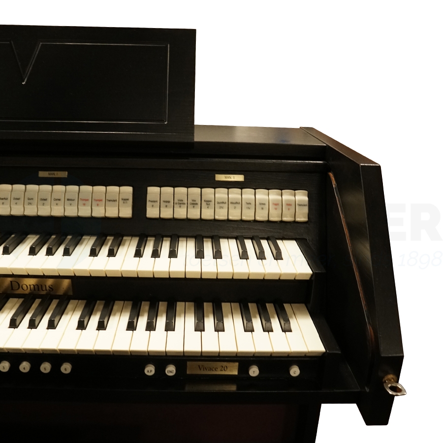 Een heel mooi klassiek orgel met 5x 31 digitaal gesampelde stemmen. Deze fraaie Domus Vivace 20 telt 2 Klavieren met 5 octaven en drukpunt en heeft 13-tonig pedaal. Volledige manuaal en pedaalkoppels. Versterking van 3 x 70 watt stereo.