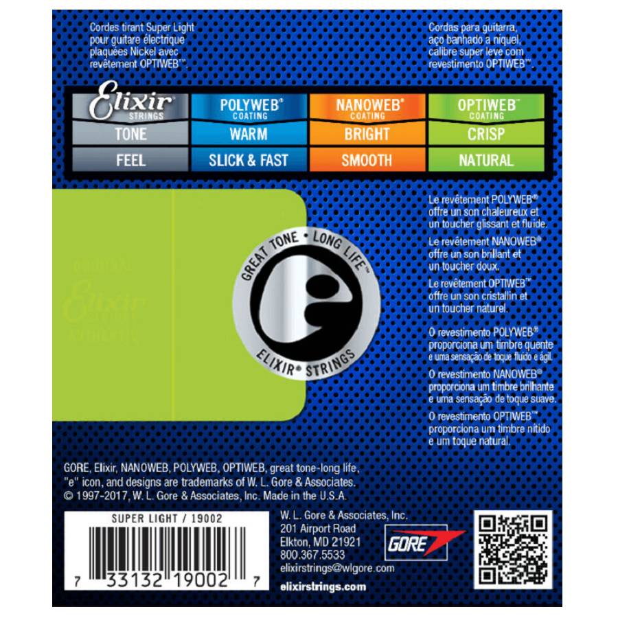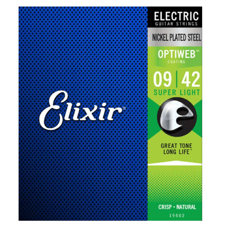De Elixir 19002 is een .009-.042 set snaren voor de elektrische gitaar. De snaren zijn voorzien van de Optiweb coating. Dit levert een uitermate natuurlijk speelgevoel op ten opzichte van de Nanoweb of Polyweb snaren van Elixir. Uniek van deze coating is dat de toon hetzelfde blijft als die van een niet gecoate snaar.