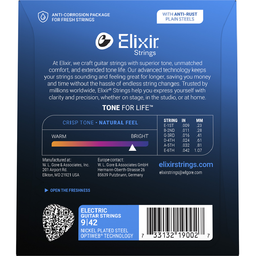 De Elixir 19002 is een .009-.042 set snaren voor de elektrische gitaar. De snaren zijn voorzien van de Optiweb coating. Dit levert een uitermate natuurlijk speelgevoel op ten opzichte van de Nanoweb of Polyweb snaren van Elixir. Uniek van deze coating is dat de toon hetzelfde blijft als die van een niet gecoate snaar.