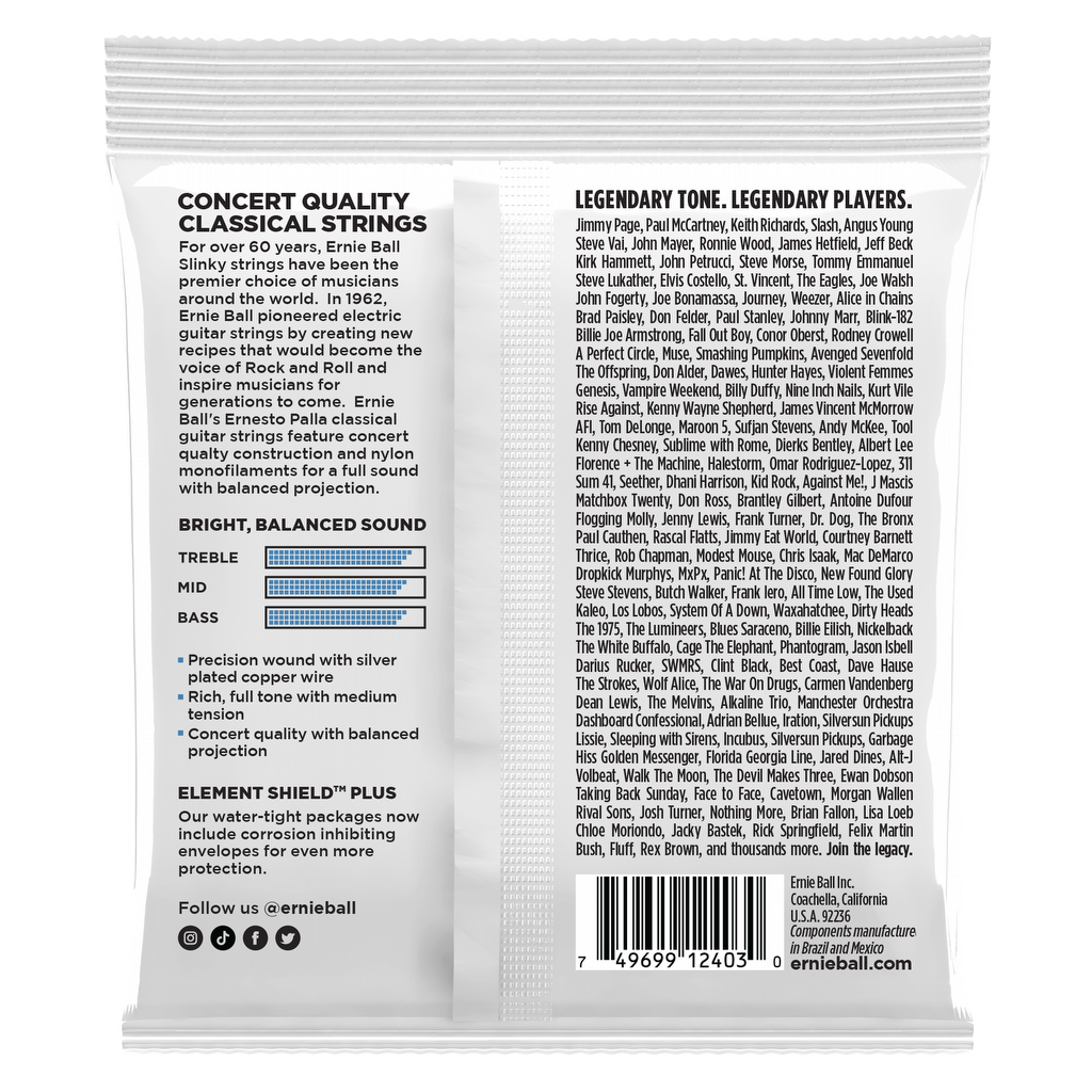 De Ernie Ball 2403 Ernesto Palla nylon gitaarsnaren zijn wereldwijd bekend dankzij de prachtige klank en lange levensduur. Ernie Ball maakt al tientallen jaren snaren voor vele soorten instrumenten. Vele professionele muzikanten gebruiken deze snaren vanwege hun karakteristieke geluid. En met de Ernesto Palla series maken ze nu ook snaren voor de klassieke gitaar. De nylon snaren zijn gemaakt van een speciaal soort monofilament, en de bassnaren bestaan uit een nylon kern met een zilverkleurige koper omhulsel dat zorgt voor een heldere, rijke toon. Kortom: De Ernie Ball 2403 Ernesto Palla zijn uitstekende snaren die iedere gitarist wel een keer geprobeerd moet hebben.