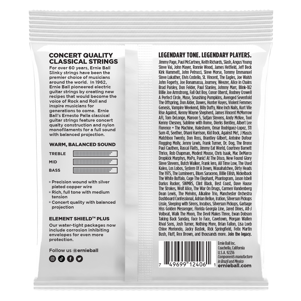 De Ernie Ball 2406 Ernesto Palla zijn wereldwijd bekend dankzij de prachtige klank en lange levensduur. Ernie Ball maakt al tientallen jaren snaren voor vele soorten instrumenten. Vele professionele muzikanten gebruiken deze snaren vanwege hun karakteristieke geluid. En met de Ernesto Palla series maken ze nu ook snaren voor de klassieke gitaar. De hoge snaren zijn gemaakt van een speciale soort zwarte nylon. Deze speciale soort nylon produceert een prachtige heldere klank. En samen met de zilveren bassnaren hebt u een set die gecontroleerd en rijk klinkt. Kortom: Een snarenset die elke gitarist wel eens moet proberen.