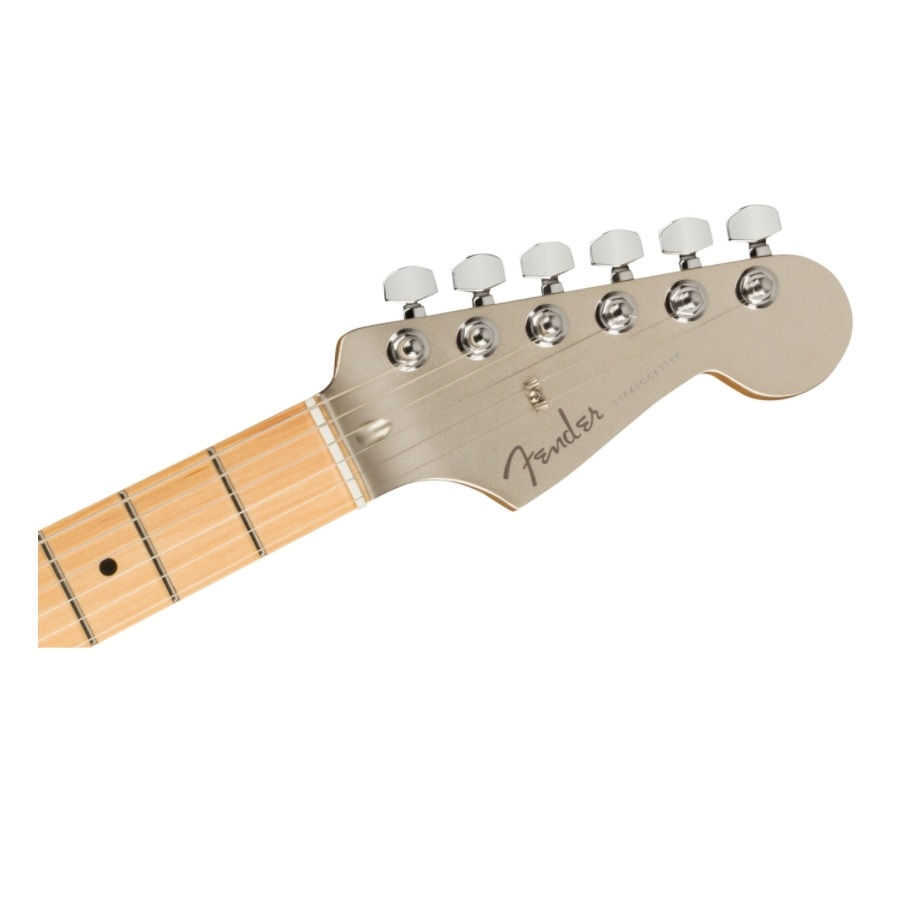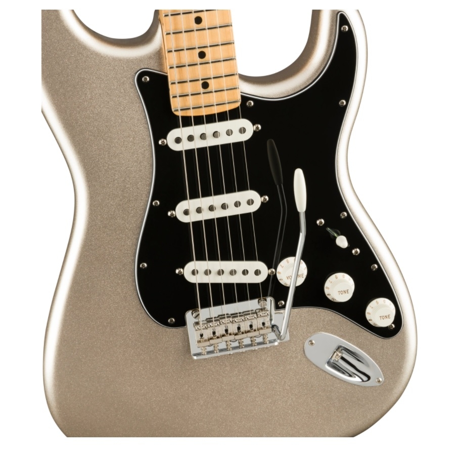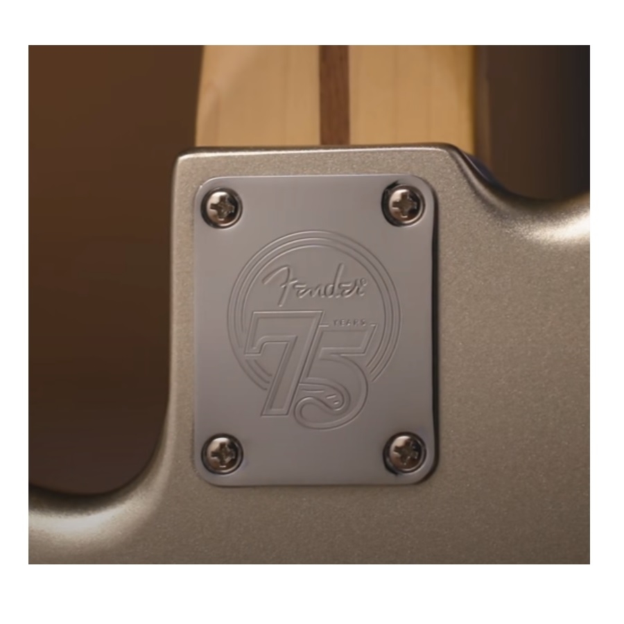 De 75th Anniversary Stratocaster heeft een opvallend uiterlijk. Fender heeft een ‘diamond’ kleur gebruikt, wat een lichte crème kleur is met een schitterende finish. Dit geeft de gitaar een uniek uiterlijk, terwijl de zwarte slagplaat de gitaar een origineel tintje geeft. Bovendien is de headstock ook in dezelfde kleur gespoten, zodat de gitaar een luxueus uiterlijk heeft. De body is van elzenhout gemaakt en de hals van esdoornhout. Daarnaast heeft de hals een satijnen finish, waardoor deze comfortabel door de hand glijdt. Daarnaast heeft de esdoornhouten toets medium grote fretten, waardoor deze speelbaar zijn voor elke gitarist. De hals is op de body geschroefd met een jubileumplaat. Dit is duidelijk een unieke Stratocaster.