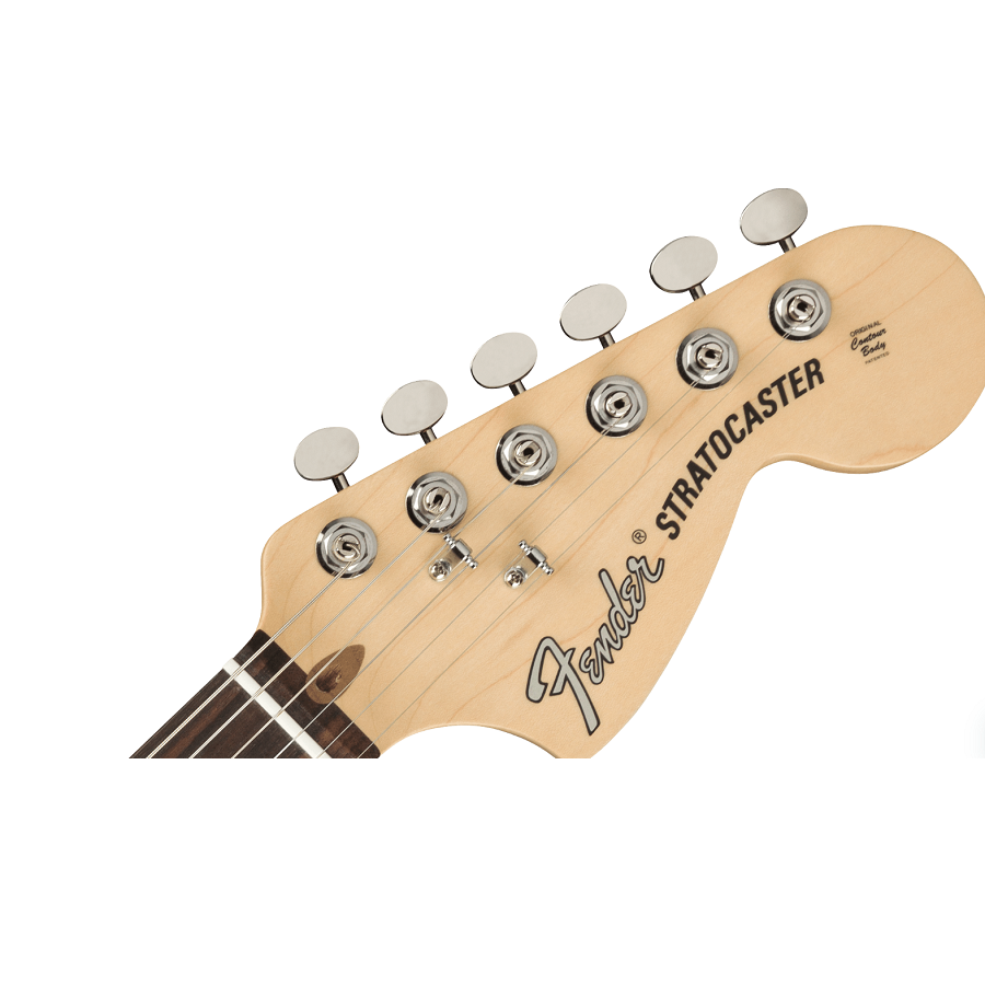 Natuurlijk produceert Fender binnen deze serie ook dé Rock ’n Roll gitaar: de Stratocaster. Deze Stratocaster ziet er ook prachtig vintage uit, maar met moderne voordelen. De hals heeft namelijk de moderne C-vorm wat fijner in de hand ligt en het spelen makkelijker maakt. De nieuwe elementen mogen dan modern zijn, maar ze kunnen nog steeds dat typische jaren ’70 Rock ’n Roll geluid produceren. Echter heeft dit model ook een humbucker element, naast de twee single coils. Dit zorgt ervoor dat u het geluid wat vetter en warmer kunt maken. Met de vijfstandenschakelaar kunt u dus verschillende combinaties maken met de elementen en zodoende heeft u dus veel veelzijdigheid. De Stratocaster bevat wel vintage stemmechanieken wat er erg authentiek uitziet maar ook voor een fijne stemstabiliteit zorgt. Vintage stemmechanieken zijn ook erg mooi want ze hebben geen uitstekende snaareinden, wat moderne mechanieken wel hebben. De gitaar heeft een elzenhouten body, waardoor de gitaar weinig weegt en een fijne sustain heeft. Daarnaast heeft de gitaar een esdoornhouten hals met een palissander toets.