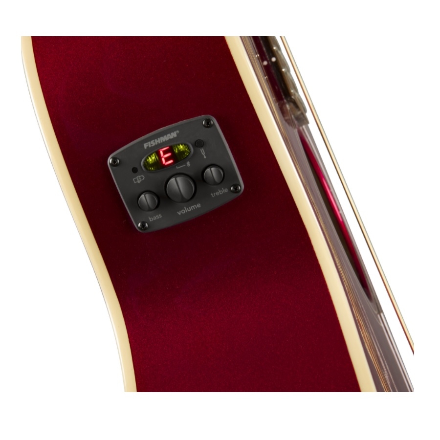 De Newporter Player heeft een bovenblad van sparrenhout. Sparrenhout is erg populair, want het is enorm stevig, heeft een goede resonantie en een prachtig warm geluid. Het is dus een fantastische keuze voor een bovenblad. Het is warm genoeg voor een mooi vol slaggitaargeluid, maar nog helder genoeg voor een duidelijke tokkel. De achter- en zijkanten zijn van gelamineerd mahoniehout gemaakt. Mahoniehout heeft een fijne resonantie en een helder geluid. Het feit dat het gelamineerd is, zorgt ervoor dat de gitaar robuust is. De achter- en zijkanten kunnen dus tegen een stootje en zijn ook beter bestand tegen vocht en temperatuurverschillen. De hals is ook van mahoniehout gemaakt en de toets van walnoot. Deze combinatie zorgt voor een comfortabele speelervaring, maar ook voor een mooi donker uiterlijk. De klankkast en de headstock zijn in een mooie diepe rode kleur afgewerkt, voor een opvallende en professionele uitstraling. De gitaar wordt geleverd met een CD-1 Fishman preamp. Deze zit ingebouwd en zorgt ervoor dat de gitaar zo authentiek mogelijk versterkt wordt. De preamp heeft ook een ingebouwd stemapparaat. Kortom, de Newporter Player is een veelzijdige gitaar voor een lage prijs!