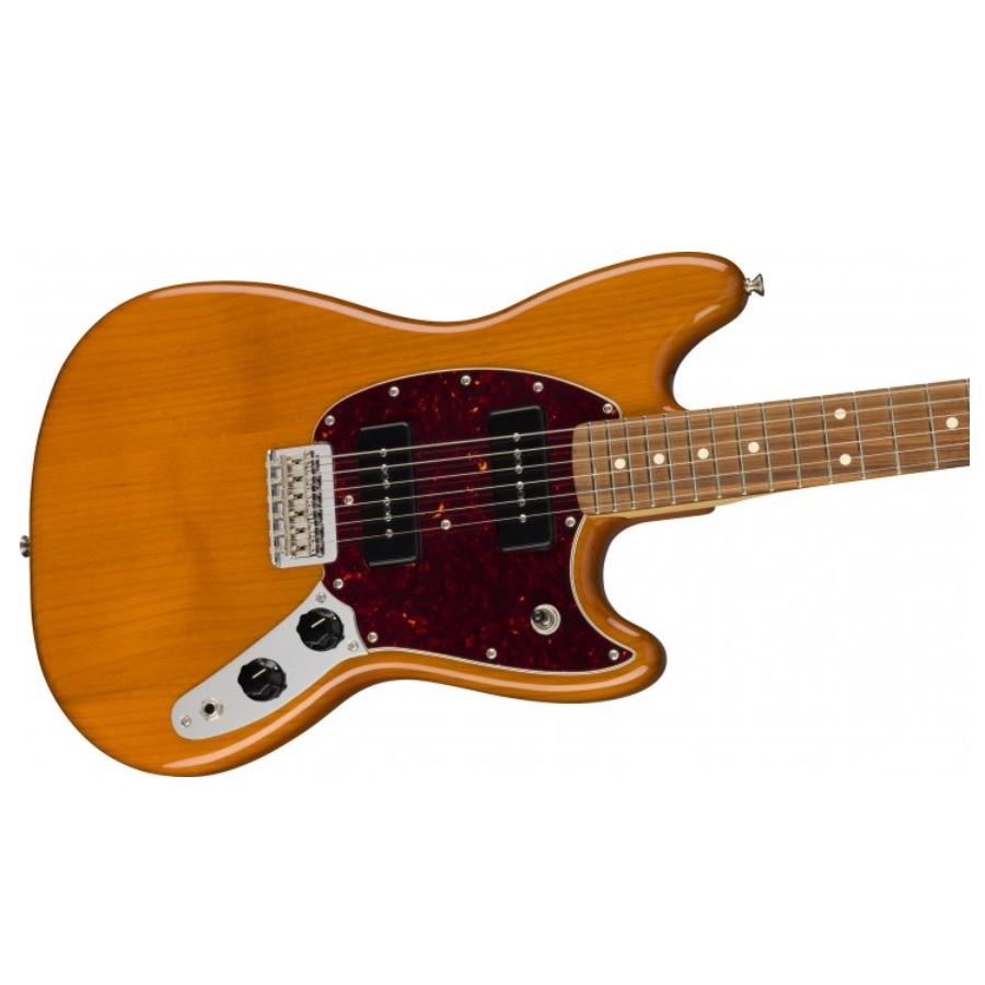 Fender heeft de Mustang ontwikkeld in 1964 als een ‘student model’. In de jaren ’90 zijn deze gitaren terug op de markt gebracht, waar ze zeer populair werden als alternatieve rockgitaar, voornamelijk in de grunge scene. De Player Mustang is dan ook op dat model gebaseerd. De gitaar heeft twee P90 single-coil elementen, waarmee dat typische grunge geluid bereikt kan worden. De elementen zijn af te stellen met de driestandenschakelaar, de volumeknop en de master toonknop. Opvallend aan de gitaar is de six-saddle brug, die door de body gaat. De body is van elzenhout gemaakt, dit zorgt voor een helder en duidelijk geluid. De hals is van esdoornhout, wat fijn door de hand glijdt. De toets is van Pau Ferro gemaakt, wat een duurzamere houtsoort is dan palissander en een warm geluid creëert. Kortom, een unieke gitaar voor een lage prijs!