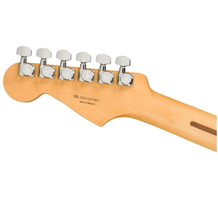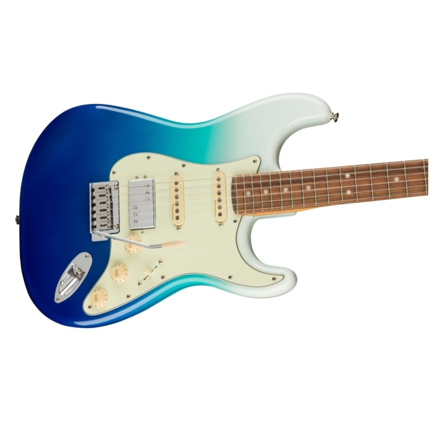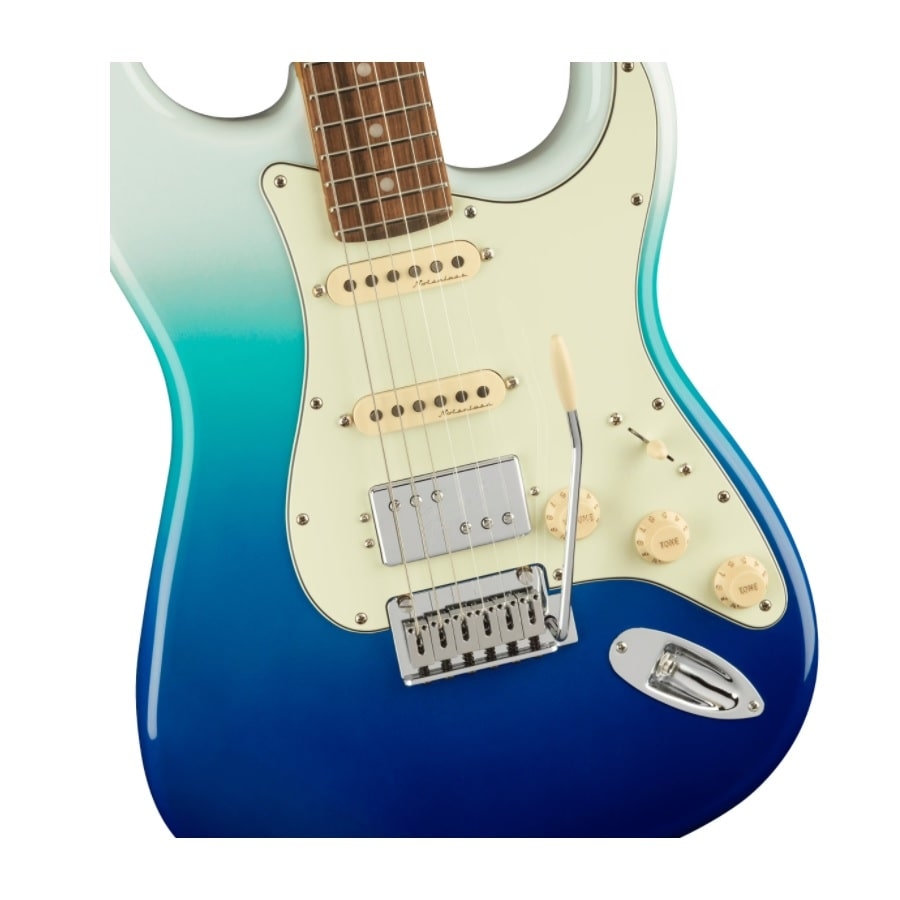 De Player Plus Belair Blue is een wat innovatievere versie van de standaard Fender Player Stratocaster. De Player Plus heeft namelijk een creatievere afwerking en heeft een HSS-elementconfiguratie met verbeterde elementen. Dit betekent dat de gitaar één humbucker heeft en twee single-coil elementen, in plaats van drie single-coil elementen. Deze elementen zijn ook van hoge kwaliteit, omdat de humbucker ook te splitsen is en de single-coils ‘no-hum’-technologie hebben. Splitsen betekent dat een humbucker, een dubbelspoelelement, in een single-coil, een enkelspoelelement, veranderd kan worden. Dit kan omdat één van de spoelen uit het dubbelspoelelement uitgeschakeld kan worden, waardoor het een enkelspoelelement wordt. Dit kan worden gedaan met het omhoog halen of induwen van de toonknop. Met de Player Plus heeft u dus veel verschillende elementconfiguraties en toonopties! ‘No-hum’-technologie betekent dat de single-coils geen interferentie veroorzaken. Dit is namelijk een groot probleem met single-coils, omdat ze niet in een magnetische kring staan kunnen ze andere signalen opvangen waardoor uw gitaar een soort brommende toon kan gaan produceren. Dit is erg vervelend, waardoor Fender deze ‘no-hum’-single-coils heeft ontwikkeld. Daarnaast is de body van elzenhout gemaakt, wat voor een lichte maar stevige gitaar zorgt. De hals is van esdoornhout gemaakt en de toets van pau ferro, wat een mooie en comfortabele combinatie is. Kortom, de Fender Player Plus Belair Blue is de ideale gitaar voor de creatieve gitarist!