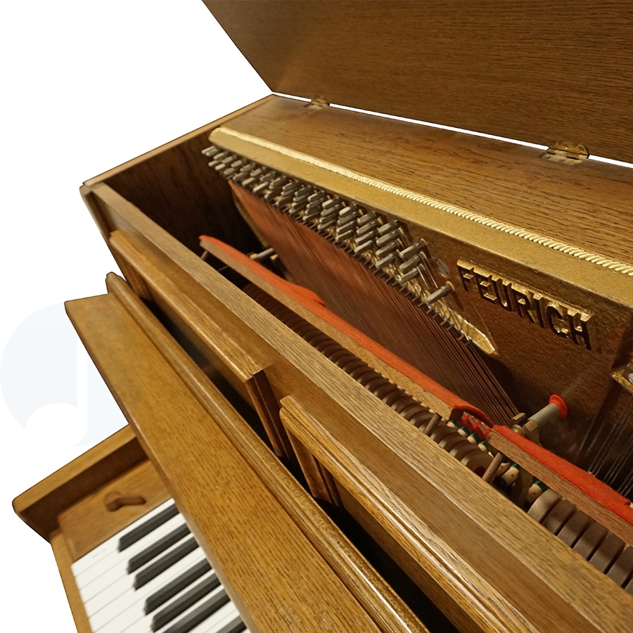 De Feurich 1.05 is een prachtige akoestische piano met fraaie klassieke details in het meubel. Met deze piano haalt u naast een waanzinnig instrument echt een meubelstuk in huis. De piano is gebouwd in 1974 in Duitsland bij Langlau. In de fabriek werkte destijds rond de 300 medewerkers en werden rond de 2000 piano’s per jaar gebouwd die alom goed werden aangeschreven. Dat is bij deze piano die technisch volledig is nagelopen nog steeds te merken aan het mooie klankkarakter! De piano wordt geleverd inclusief bijpassende klassieke pianokruk bekleed met een sierlijk patroon. Leuk detail is de meegeleverde toetsenloper in hetzelfde patroon als de kruk.