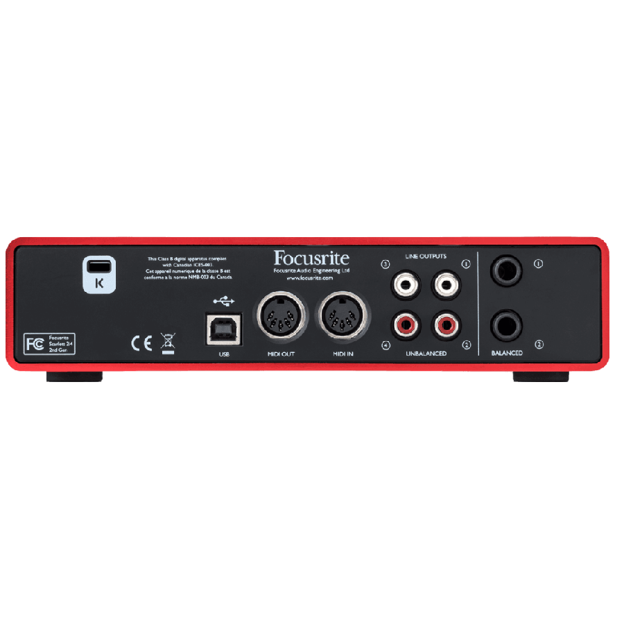 De interface beschikt over gebalanceerde uitgangen, waardoor het best mogelijk uitgangssignaal gegarandeerd kan worden. Ten opzichte van de kleinere 2i2 beschikt deze interface over midi in- en uitgangen waardoor u midiapparatuur ook via deze geluidskaart kan worden aangesloten.