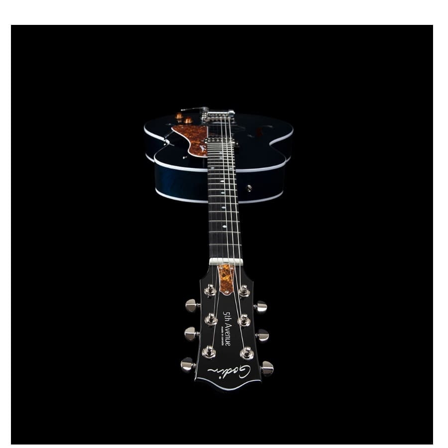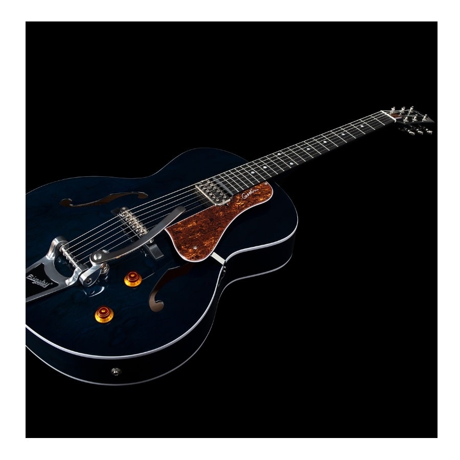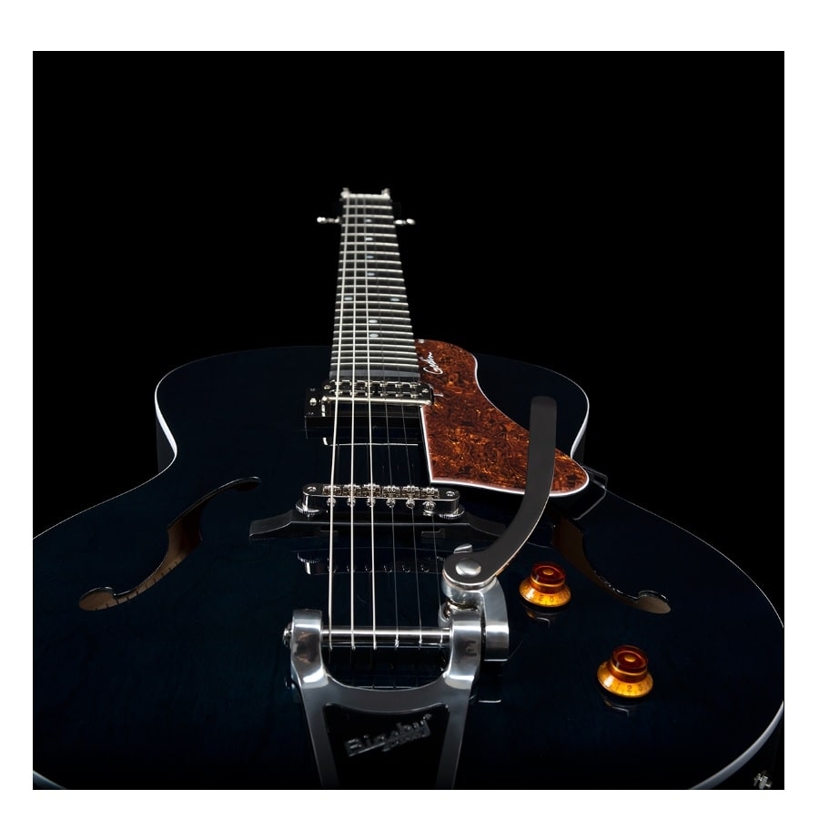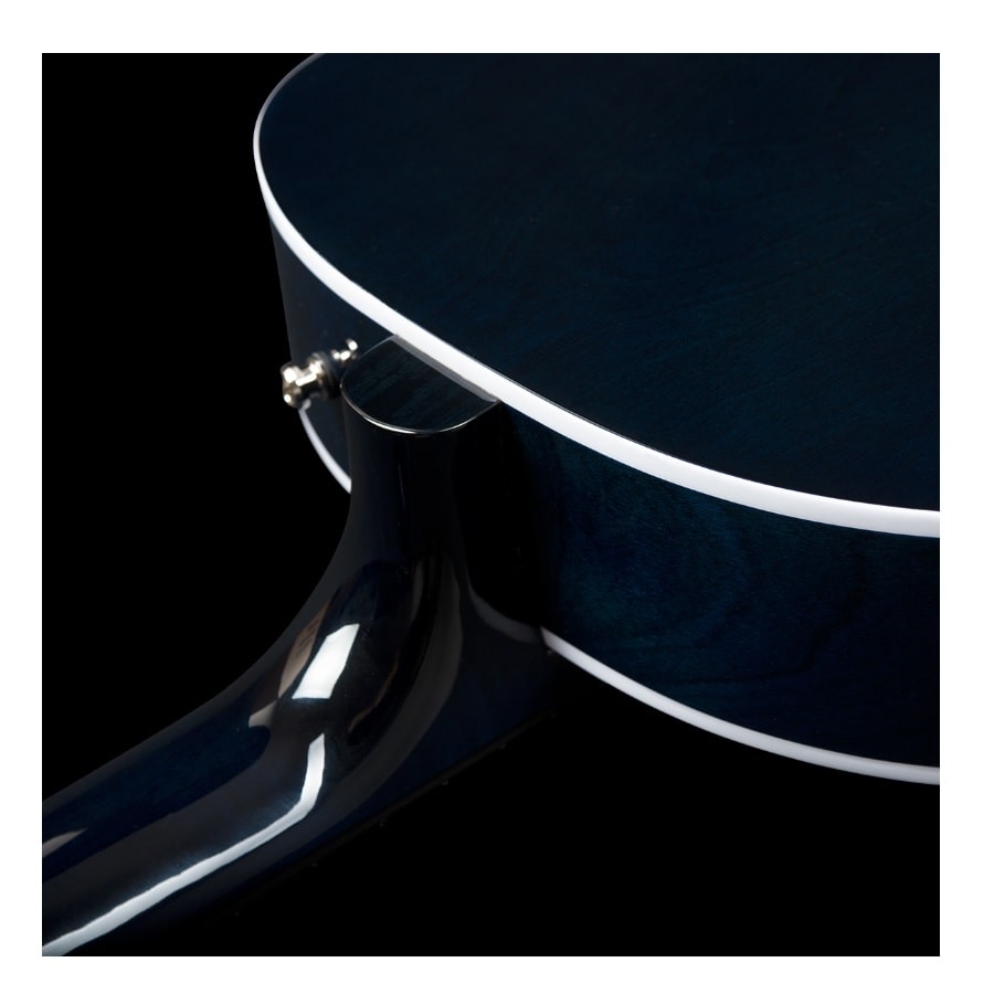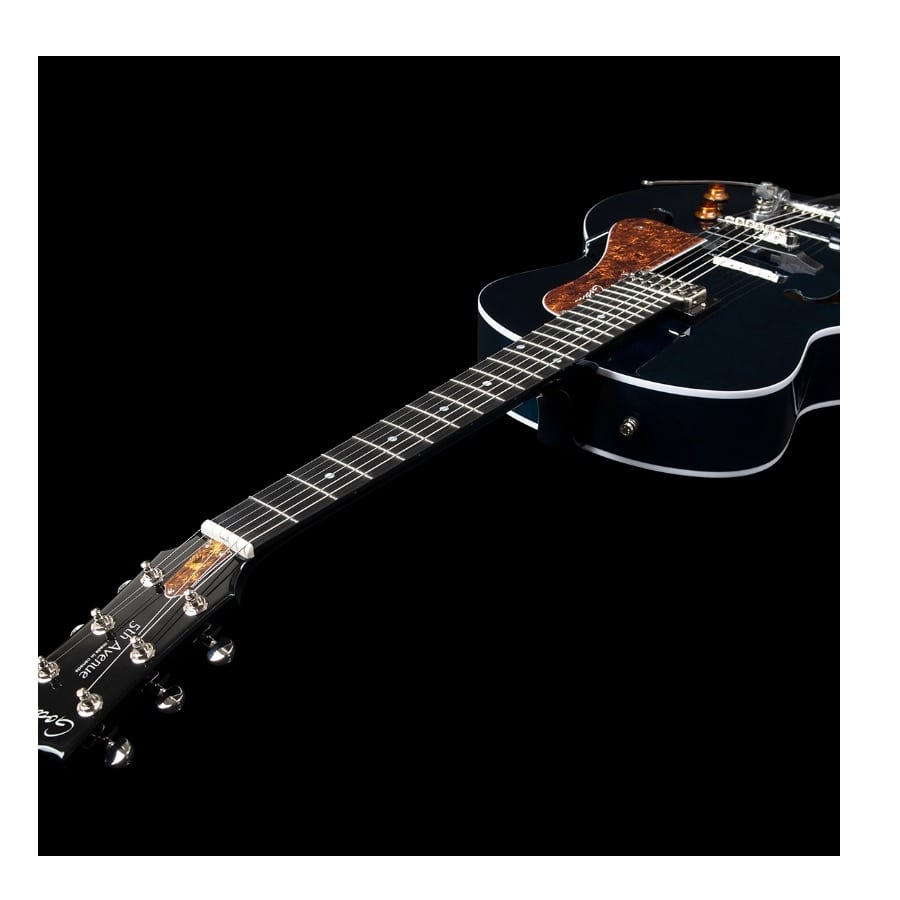 De 5th Avenue Night Club Indigo Blue is een prachtige hollow body gitaar van Godin. Het is een opvallende gitaar, omdat deze een mooie donkerblauwe kleur heeft met een klassiek Bigsby systeem en een opvallende slagplaat. Niet alleen het uiterlijk is mooi, maar het geluid is zeker vergelijkbaar. De gitaar heeft maar één element: een TV Jones Classic. Dit is een klassieke humbucker die voor een mooi blues geluid zorgt. Zodoende is de gitaar zeer geschikt voor gitaristen die van een vintage klank houden. De klankkast is van Canadees kersenhout gemaakt, wat voor een goede sustain en een warme klank zorgt. Kersenhout articuleert ook goed, maar het is niet overdreven luid. De hals is van esdoornhout gemaakt en de toets van Richlite. Richlite is een synthetische houtsoort wat dezelfde speelervaring heeft als authentiek toonhout maar niet onderhouden hoeft te worden. Het is ook beter voor het milieu omdat veel toonhoutsoorten voor de toets bedreigde houtsoorten zijn. Kortom, de Night Club Indigo Blue is een geweldige vintage hollow body gitaar!