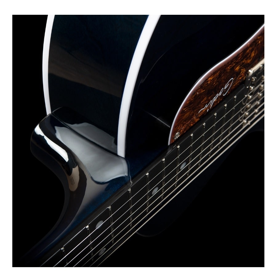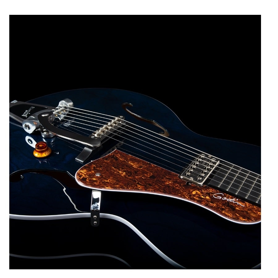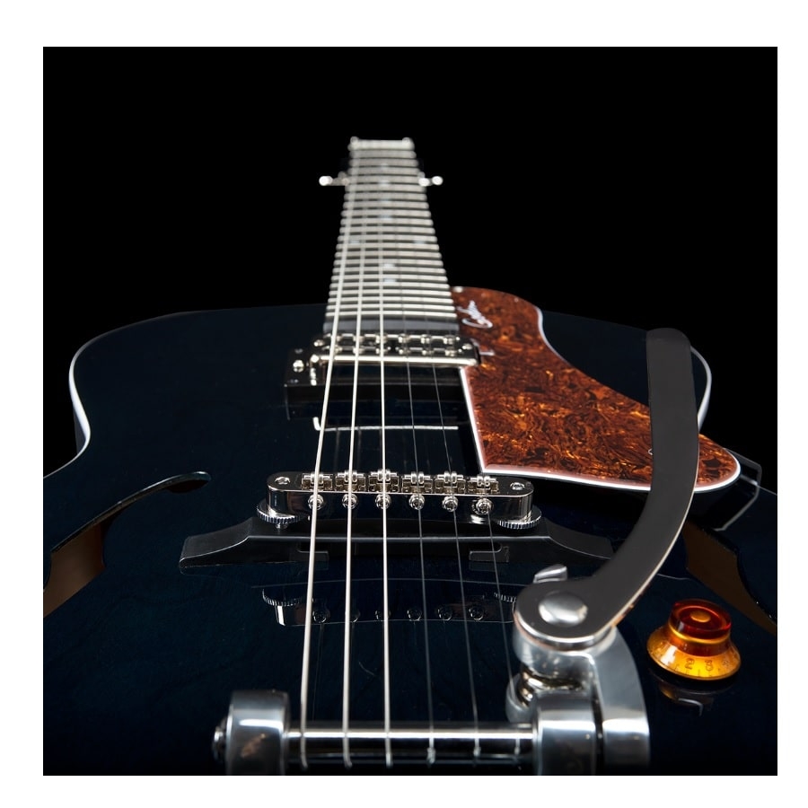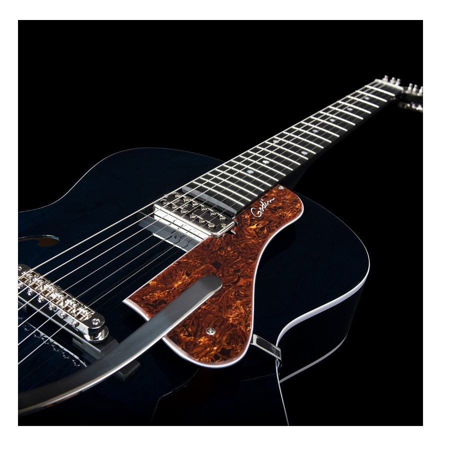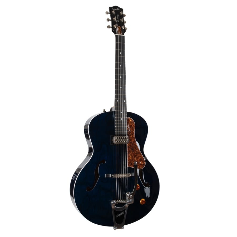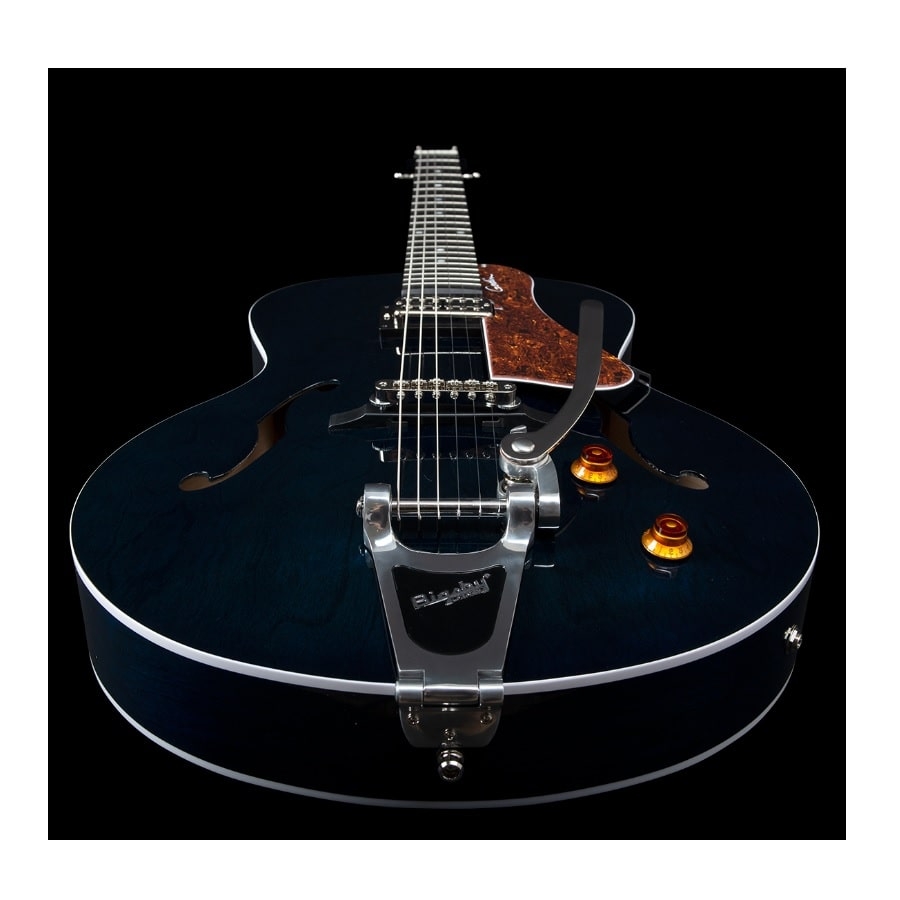 De 5th Avenue Night Club Indigo Blue is een prachtige hollow body gitaar van Godin. Het is een opvallende gitaar, omdat deze een mooie donkerblauwe kleur heeft met een klassiek Bigsby systeem en een opvallende slagplaat. Niet alleen het uiterlijk is mooi, maar het geluid is zeker vergelijkbaar. De gitaar heeft maar één element: een TV Jones Classic. Dit is een klassieke humbucker die voor een mooi blues geluid zorgt. Zodoende is de gitaar zeer geschikt voor gitaristen die van een vintage klank houden. De klankkast is van Canadees kersenhout gemaakt, wat voor een goede sustain en een warme klank zorgt. Kersenhout articuleert ook goed, maar het is niet overdreven luid. De hals is van esdoornhout gemaakt en de toets van Richlite. Richlite is een synthetische houtsoort wat dezelfde speelervaring heeft als authentiek toonhout maar niet onderhouden hoeft te worden. Het is ook beter voor het milieu omdat veel toonhoutsoorten voor de toets bedreigde houtsoorten zijn. Kortom, de Night Club Indigo Blue is een geweldige vintage hollow body gitaar!