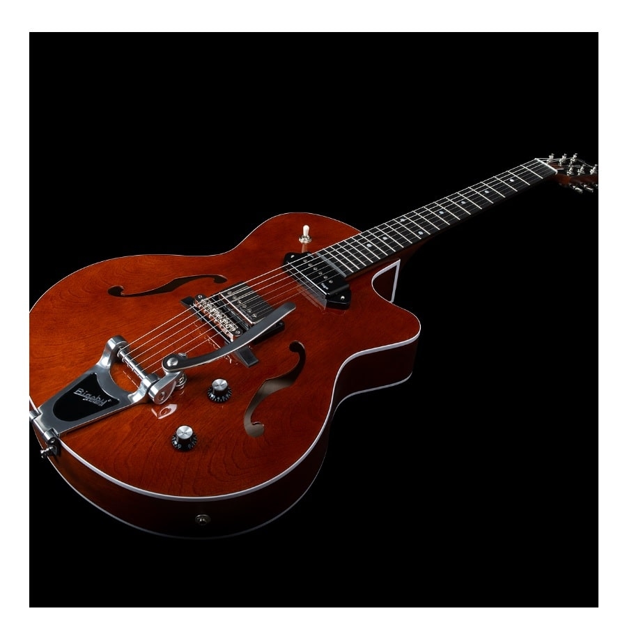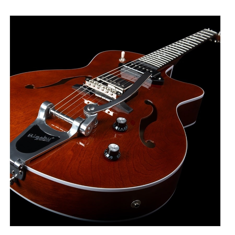 Deze gitaar is een hollow body gitaar. Dit betekent dat de gitaar een soort combinatie is van een akoestische gitaar en een elektrische gitaar. Een hollow body heeft namelijk zowel een klankkast als elementen en knoppen. Het werkt als volgt: de trilling van de snaar resoneert in de klankkast en op het holle hout, waarna deze resonantie wordt opgevangen door de elementen. Dit resulteert in een prachtig uniek geluid; hollow body gitaren hebben een enorm volle en heldere klank. Dit is anders dan een semi-akoestische gitaar, wat een akoestische gitaar met één akoestisch element is, waardoor het versterkte geluid alleen akoestisch klinkt. Vanwege de elektrische elementen van een hollow body gitaar zijn ook vele soorten vervorming mogelijk, en zijn ze ook uitstekend voor solo’s en riffs. Bovendien zitten de klankgaten van een hollow body gitaar vaak aan de zijkanten, waardoor de resonantie anders klinkt dat als het klankgat onder de snaren zit.