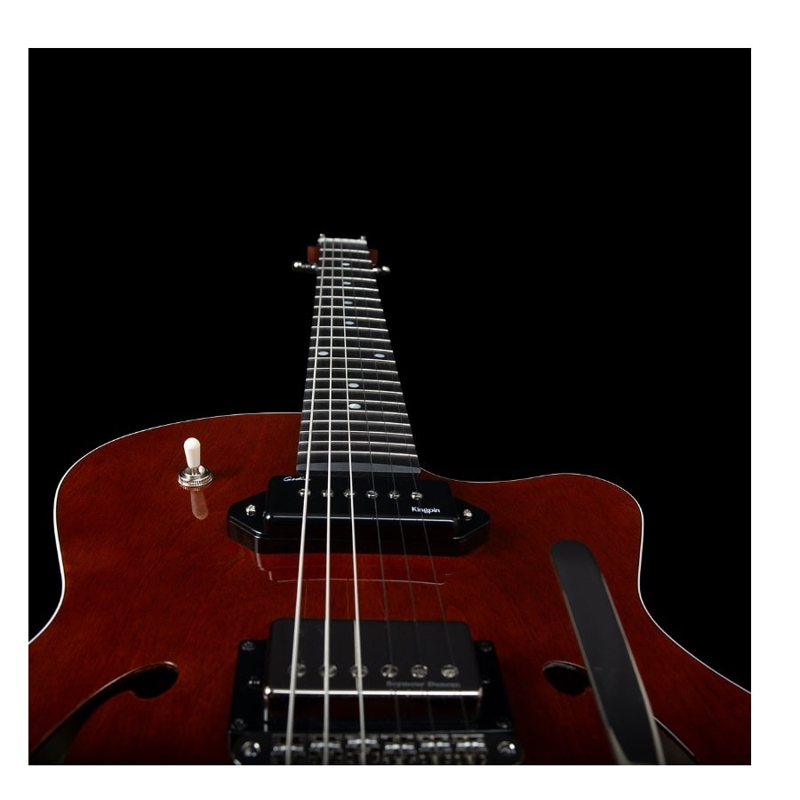 De 5th Avenue Uptown Custom Havana Brown is een opmerkelijke gitaar, niet alleen vanwege het prachtige uiterlijk maar ook vanwege de unieke elementconfiguratie. De gitaar heeft namelijk een P-90 bij de hals en een humbucker bij de brug. Dit is een zeldzame combinatie, maar zorgt voor een geweldig geluid. De P-90 klinkt wat scherper en helderder, ideaal voor iets meer articulatie en aandacht, terwijl de humbucker dieper, warmer en voller klinkt. De combinatie hiervan zorgt dus voor een vol en scherp geluid. De body van de gitaar is van Canadees kersenhout gemaakt. Dit is een duurzame houtsoort wat voor een warm geluid zorgt en een fijne sustain. De hals is van esdoornhout gemaakt en de toets van Richlite. Richlite is een synthetische houtsoort wat duurzamer is qua milieu maar ook qua levensduur. Het speelt net zoals een authentieke toonhout maar hoeft niet onderhouden te worden.