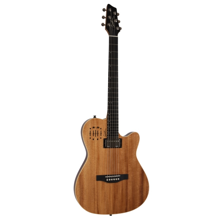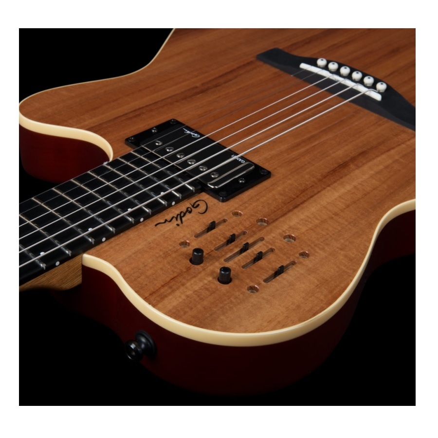 De Godin A6 Ultra Koa HG is een hybride gitaar. Een hybride gitaar kan dus beide akoestische en elektrische geluiden creëren. Dit komt doordat de gitaar semi-hollow body is, wat betekent dat de body van de gitaar gedeeltelijk open is. Het is dus niet een compleet holle klankkast, zoals bij een akoestische gitaar, maar heeft de gitaar meerdere holle compartimenten wat voor de resonantie zorgt. Daarnaast heeft de A6 Ultra een elektrisch element, een humbucker in de halspositie, en een akoestisch element onder de brug. Deze elementen zijn via hetzelfde systeem te gebruiken, door ze op dezelfde versterker aan te sluiten kan met de knoppen worden geselecteerd welk element er gebruikt wordt, akoestisch of elektrisch. De gitaar heeft echter ook een modernere optie: er zitten namelijk twee inputs in de gitaar. Zodoende is het mogelijk om de humbucker op een elektrische versterker aan te sluiten en het akoestische element op een akoestische versterker. Dit is voordelig omdat een elektrische versterker het geluid van een humbucker beter maakt terwijl een akoestische versterker het akoestische geluid enorm verbeterd. Beide elementen kunnen natuurlijk ook op dezelfde versterker aangesloten worden, maar dan zal één van de elementen waarschijnlijk benadeelt worden. De A6 Ultra heeft ook een mixsysteem waarmee de elementen afgesteld kunnen worden.