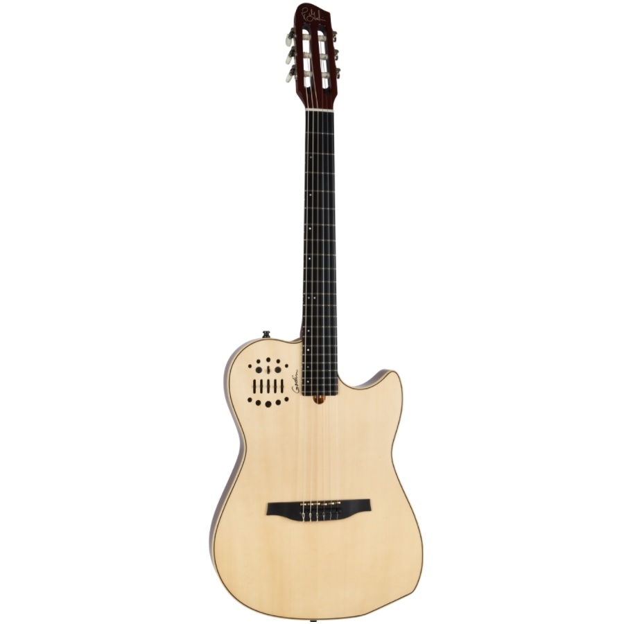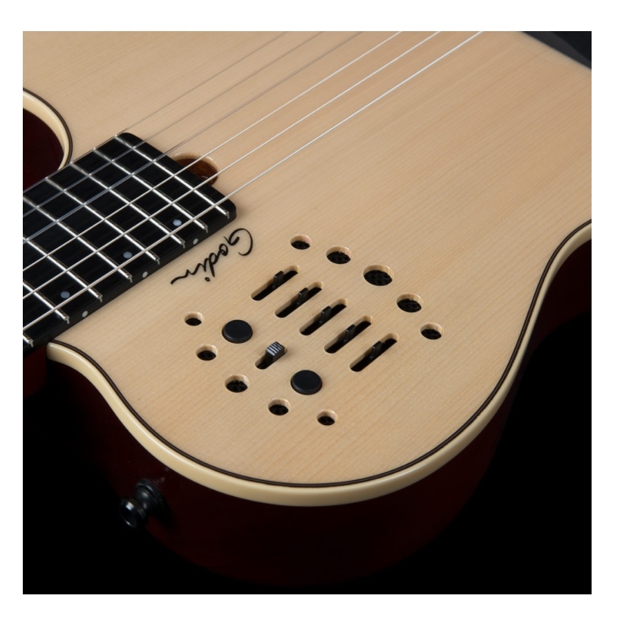 De achter- en zijkanten van de MultiAc zijn van mahoniehout gemaakt. Dit zorgt voor een warm en krachtig geluid. Het bovenblad is van sparrenhout gemaakt. Sparrenhout is één van de meest gebruikte houtsoorten voor bovenbladen. Dit komt omdat het een prachtig geluid produceert; een warme klank met een geweldige sustain. Deze combinatie is dus geweldig voor de MultiAc en zorgt voor een authentiek geluid. De hals is van mahoniehout gemaakt en de toets van Richlite. Richlite is een synthetische houtsoort. Het wordt gemaakt van hout- en papiersnippers. Deze worden samen met resin op hoge temperatuur op elkaar geperst. Dit zorgt voor een stevige plank, ideaal voor een toets. Het materiaal is erg rigide, waardoor deze niet zal buigen, en erg glad, waardoor deze comfortabel speelt. Het is ook dicht, waardoor er geen vocht of zonlicht door kan komen. Het materiaal is dus bestand tegen elk klimaat, en hoeft niet onderhouden te worden. Het is dus een goede keuze voor een innovatieve gitaar, zoals de MultiAc. Kortom, de MultiAc is een zeer innovatieve en professionele gitaar van Godin!
