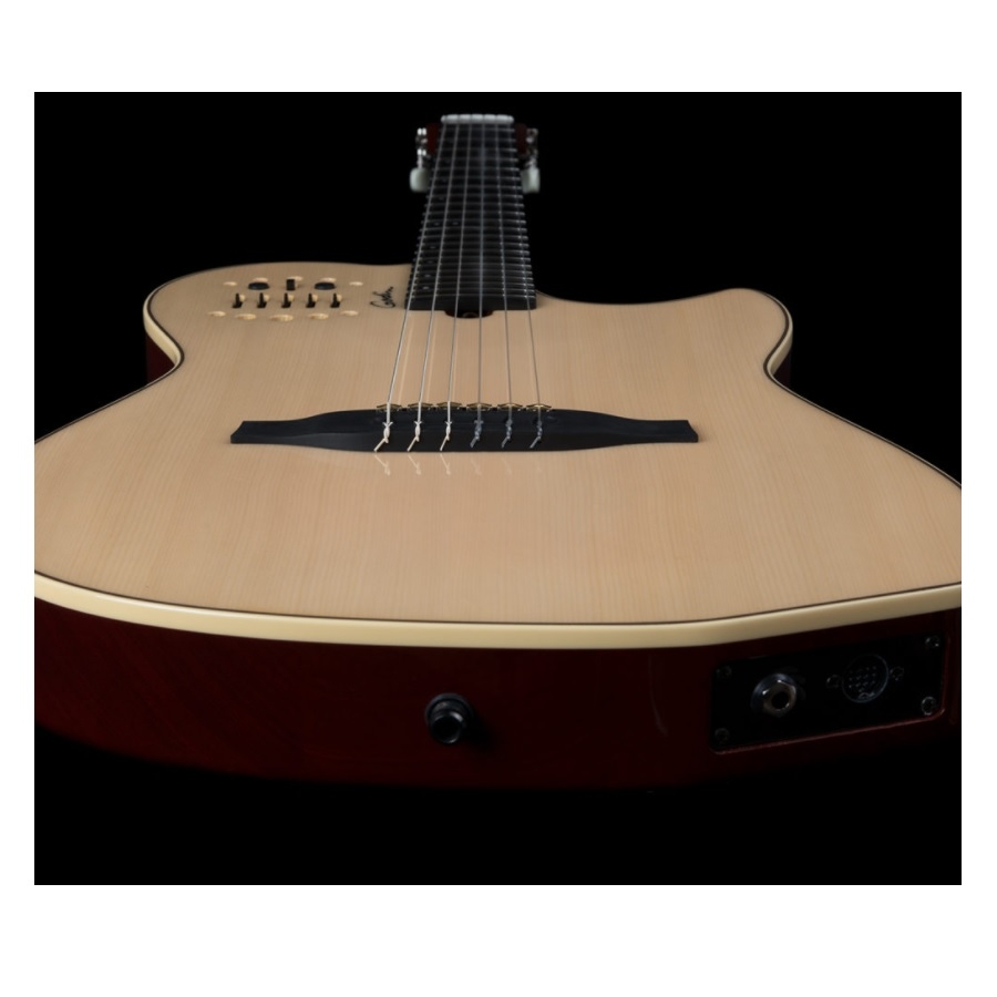 De MultiAc is een klassieke en een elektrische gitaar. Dit is innovatief; de combinatie tussen westerngitaren en elektrische gitaren is al erg vaak gemaakt, maar de combinatie met klassieke gitaren blijft redelijk weg. De semi-akoestische klassieke gitaar bestaat al wel, maar dat komt niet in de buurt van een elektrische gitaar. De MultiAc is een klassieke gitaar die geïnspireerd is door solid body elektrische gitaren. De gitaar heeft een semi-hollow body design, wat betekent dat de body niet massief is en niet compleet hol, maar meerdere holle compartimenten heeft. Dit zorgt ervoor dat de trillingen nog iets helderder resoneren, maar niet zo vol en hard als bij een holle kast. De gitaar heeft ook geen klankgat, waardoor de resonantie voornamelijk van het hout af komt. De gitaar heeft een klassiek design: de snaren zijn van nylon gemaakt en de headstock en brug zijn op klassieke gitaren geïnspireerd, waardoor het duidelijk een klassieke gitaar is. Maar als er geen klankkast is, hoe werkt de gitaar dan? Het is eigenlijk best simpel. Bij aanslag trillen de nylon snaren, wat resoneert op het lichtelijk holle hout wat opgevangen wordt door het element, wat onder de brug zit. De gitaar heeft een piezo element, wat een standaard semi-akoestisch element is. Zodoende is het geluid zo authentiek mogelijk en zorgt het element zelf niet voor vervorming. De instellingen zijn aan te passen met de schuifregelaars op het bovenblad. De gitaar heeft een standaard jackinput, waardoor deze op een gitaarversterker aan te sluiten is, maar ook een XLR-input, voor bepaalde synthesizers. Zodoende is de gitaar erg veelzijdig.