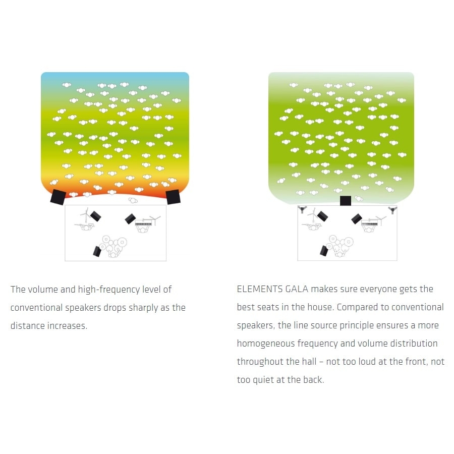 Het geluid van het systeem is ook prachtig. Het systeem heeft heldere hoge tonen en hardere middentonen, voor een zo vol en helder mogelijk geluid. Met de 15” subwoofer heeft het systeem ook een krachtige bas voor een levensechte ervaring. Bovendien heeft het systeem een speciaal publiekssysteem. De meeste PA-systemen zijn te luid aan de voorkant van het publiek en te zacht aan de achterkant. De Elements Gala is zo ontwikkeld dat het geluid overal gebalanceerd klinkt. Door de lange speakers kan het geluid evenredig verdeeld worden. Kortom, de Elements Gala is dé luxe speaker op de markt!