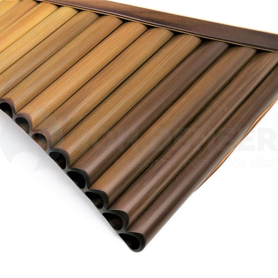 Voor degene die echt op zoek is naar de beste van de beste panfluit, kom je terecht bij de Master modellen. Het bamboe dat voor de pijpen van deze fluit wordt gebruikt is nog zorgvuldiger geselecteerd en ondergaan vervolgens een bijzondere en unieke behandelmethode. De binnenkant van de pijpen worden via een speciaal proces gladgestreken en gehard. Dit resulteert in een buitengewone respons en een fluit die het meest comfortabel te bespelen met een enorme dynamische omvang. Deze panfluit heeft 22 pijpen met een bereik van G1 tot G4. Dit is een breed bereik. Een G-majeur stemming is dan ook populair waardoor de panfluit erg veelzijdig is. Een extra uniek element aan deze panfluit is dat naast bovenstaande technologie ook nog eens elke pijp afzonderlijk wordt behandeld. Pijp voor pijp worden de pijpen aan de buitenzijde gevlamd wat zorgt voor een getrapt verloop met de perfecte hardheid voor elke pijp. Individueel klinken de pijpen hierdoor nog aangenamer. Qua uiterlijk zorgt dit voor een fraaie en zeldzame vormgeving.