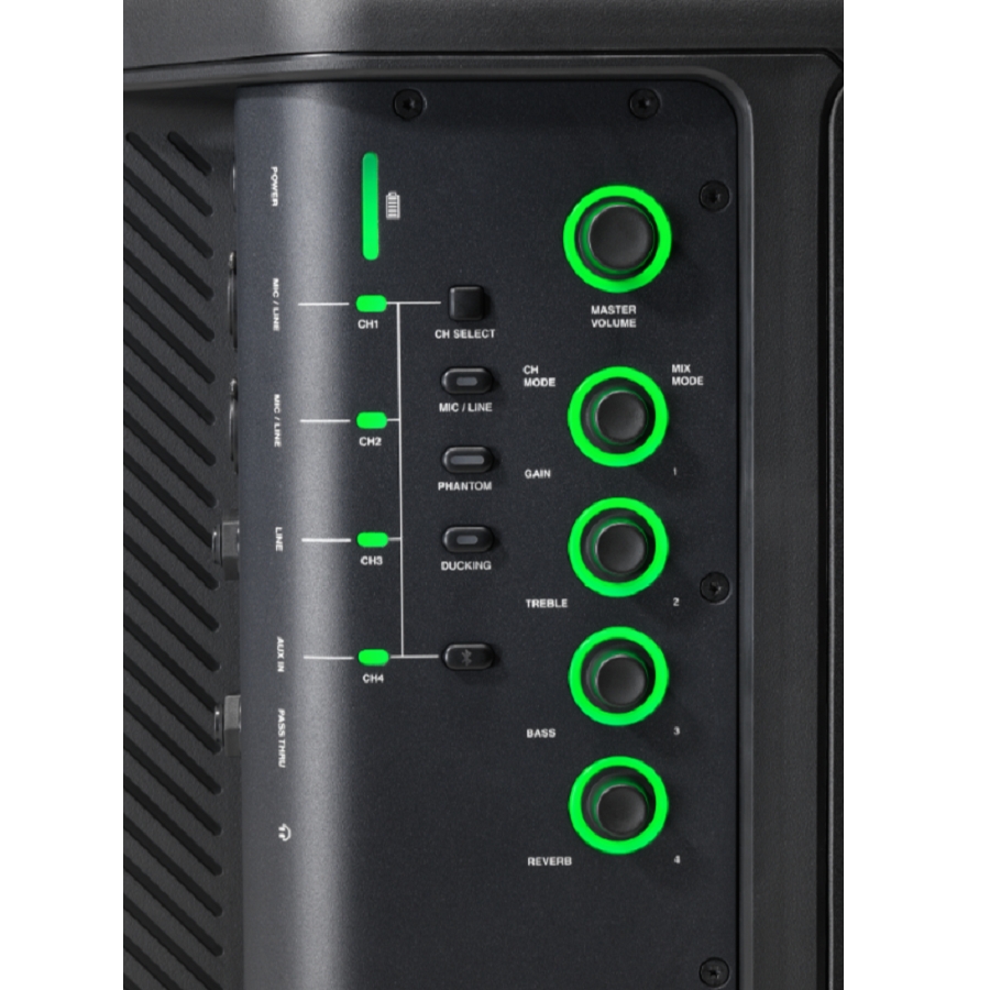 De JBL Eon One Compact beschikt over een 4-kanaals mengpaneel op de achterzijde. De eerste twee kanalen beschikken over een combi XLR/jackingang. Het derde kanaal is een jack-ingang en het vierde kanaal een minijackingang. De twee microfooningangen zijn beide voorzien van fantoomvoeding waardoor condensatormicrofoons ook kunnen worden aangesloten. Elk kanaal kan afzonderlijk worden afgeregeld met de 3-bands equalizer. Veel voorkomend is het om een Stereobeeld te creëren met twee speaker die met de THRU aansluiting aan elkaar gekoppeld kunnen worden. Ideaal voor boven uw piano of keyboard.