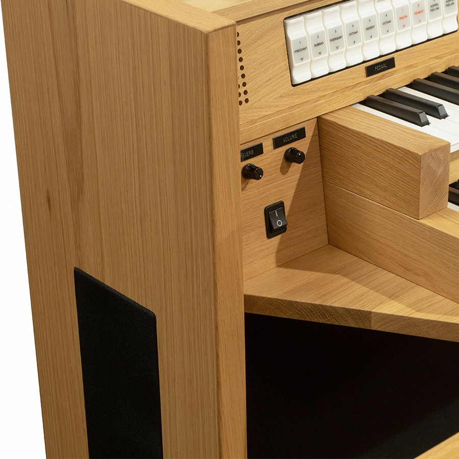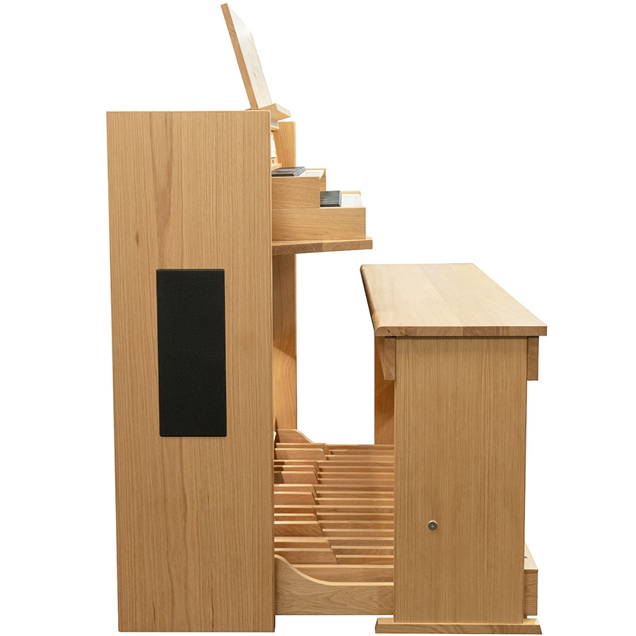 Het lijkt iets simpels, maar dat is het heden ten dagen zeker niet meer. Een opbergruimte in de orgelbank voor het bewaren van wat kleine accessoires zoals bladmuziek en een hoofdtelefoon. De Johannes de Heer VIII beschikt er standaard over! Dus geen rommelige indruk op of naast het orgel maar uw accessoires netjes opgeborgen in de orgelbank!