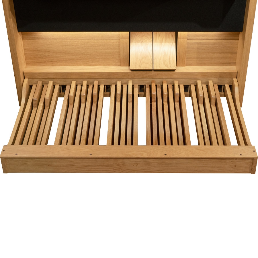 Nog zo’n puntje wat je eigenlijk als standaard zou verwachten maar dat zeker niet meer is. Bij de Johannes de Heer VIII uiteraard wel! Een led-strip met helder wit licht verlicht de orgelpedalen zodat u tijdens het spelen duidelijk zicht op de pedalen heeft. En het ziet er ook nog eens mooi uit.