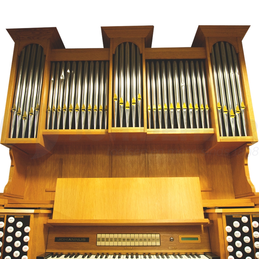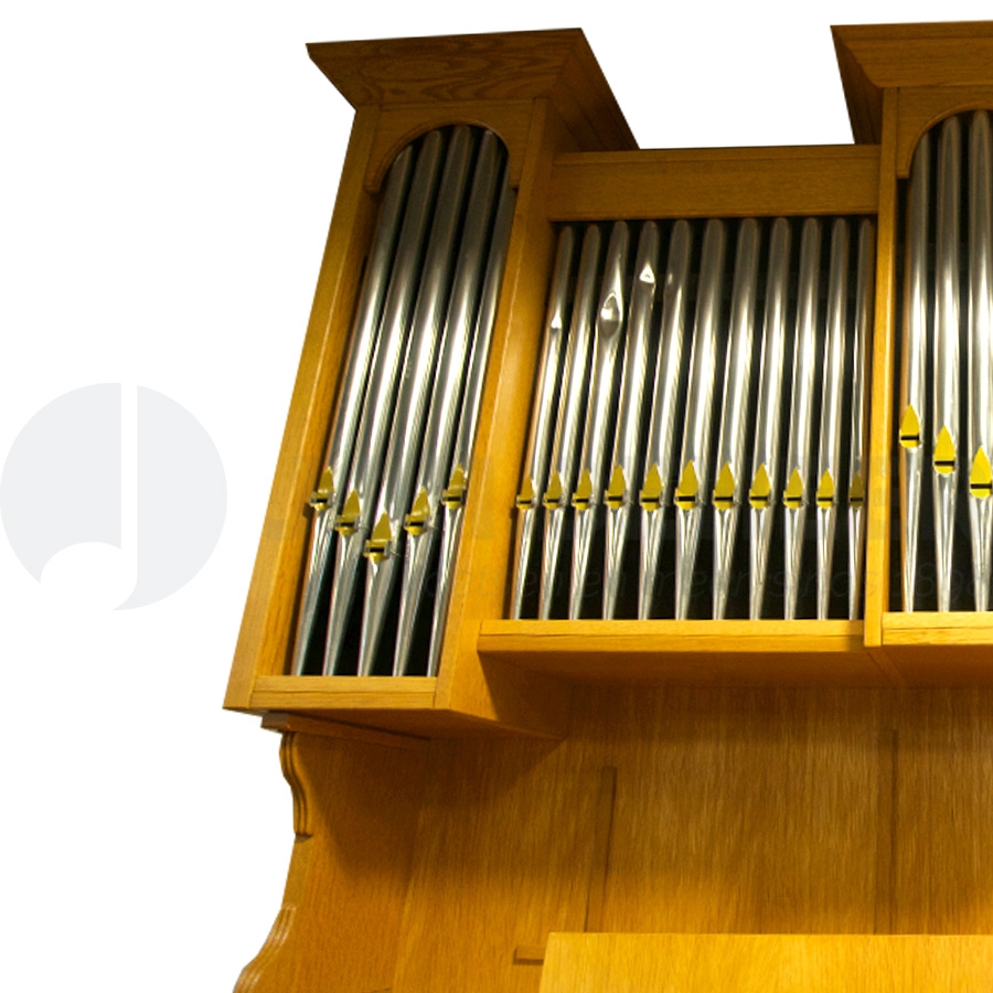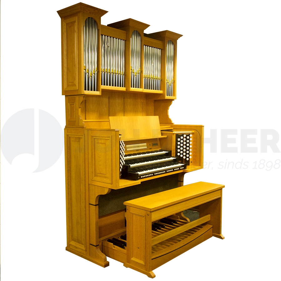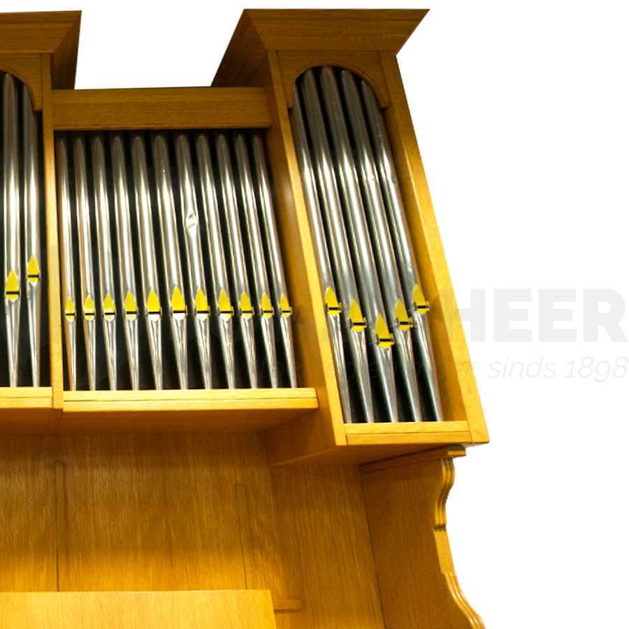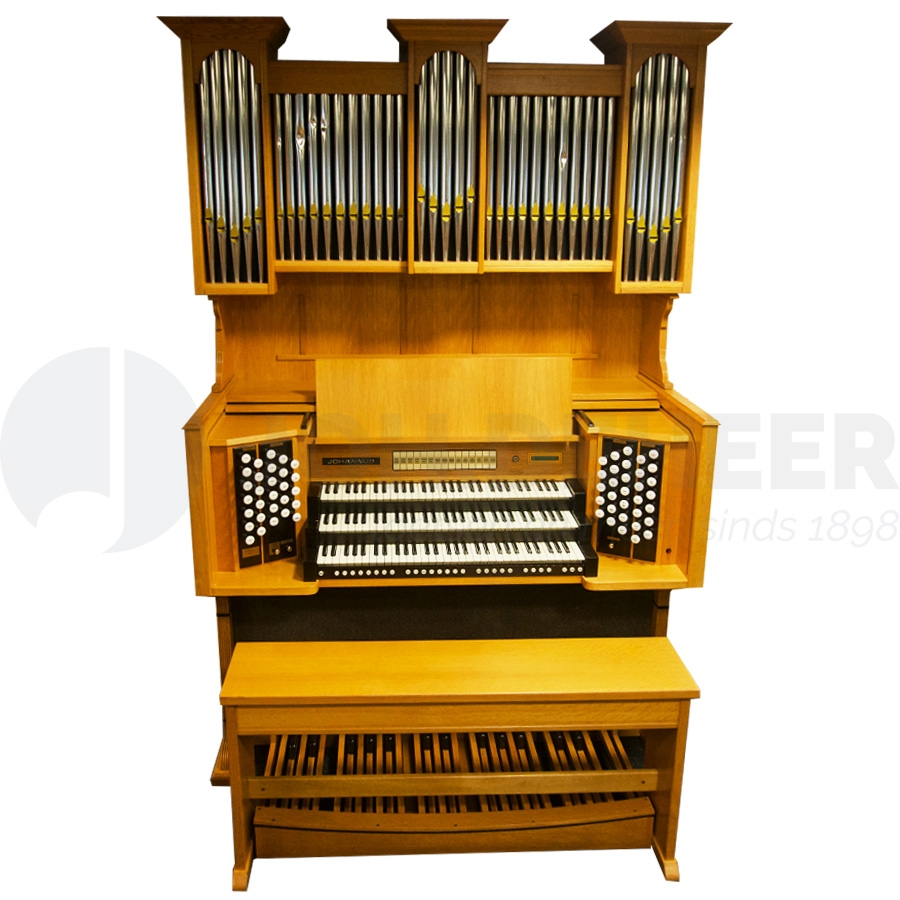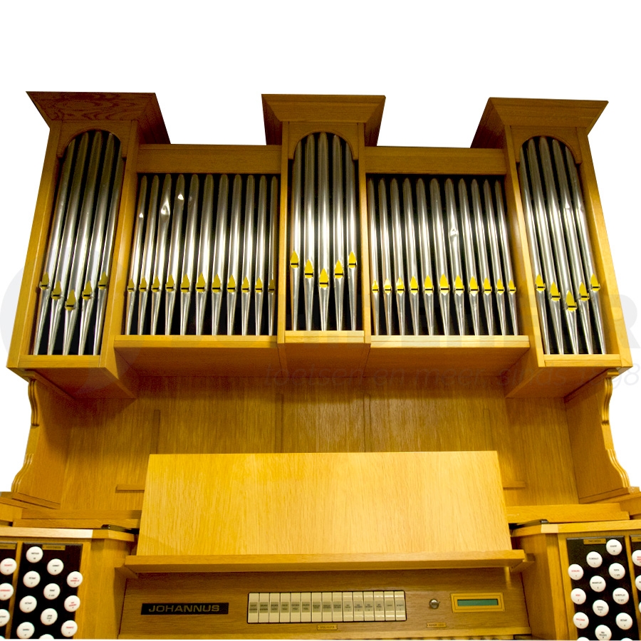 Het orgel is voorzien van een pijpfront waarachter de luidsprekers zijn geplaatst. Dit zorgt voor een authentieke uitstraling en helpt bij het creëren van een indrukwekkend geluidsbeeld.