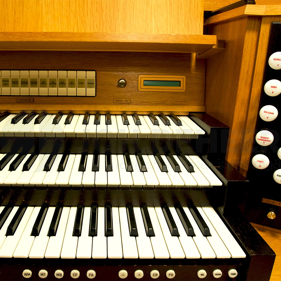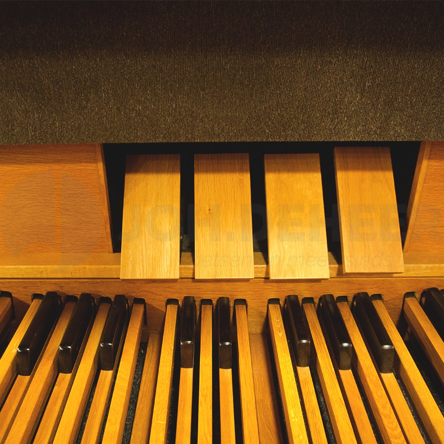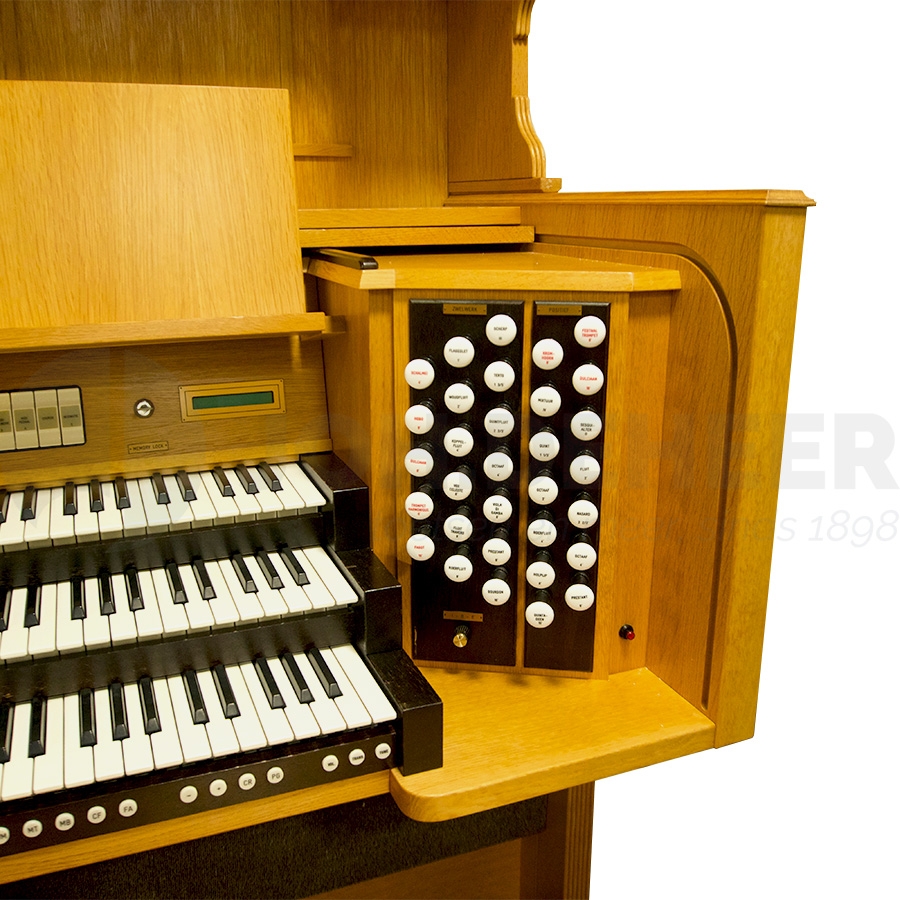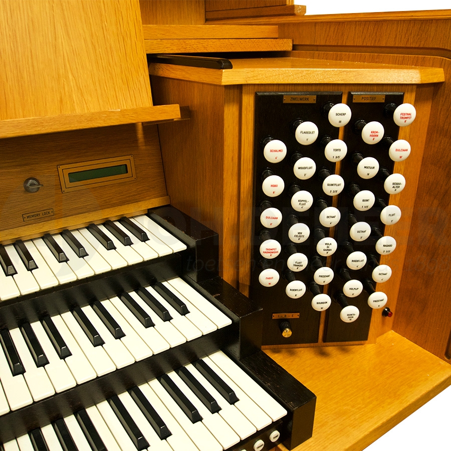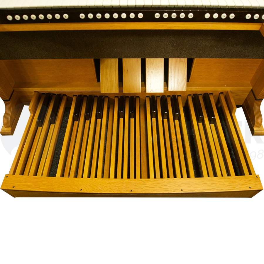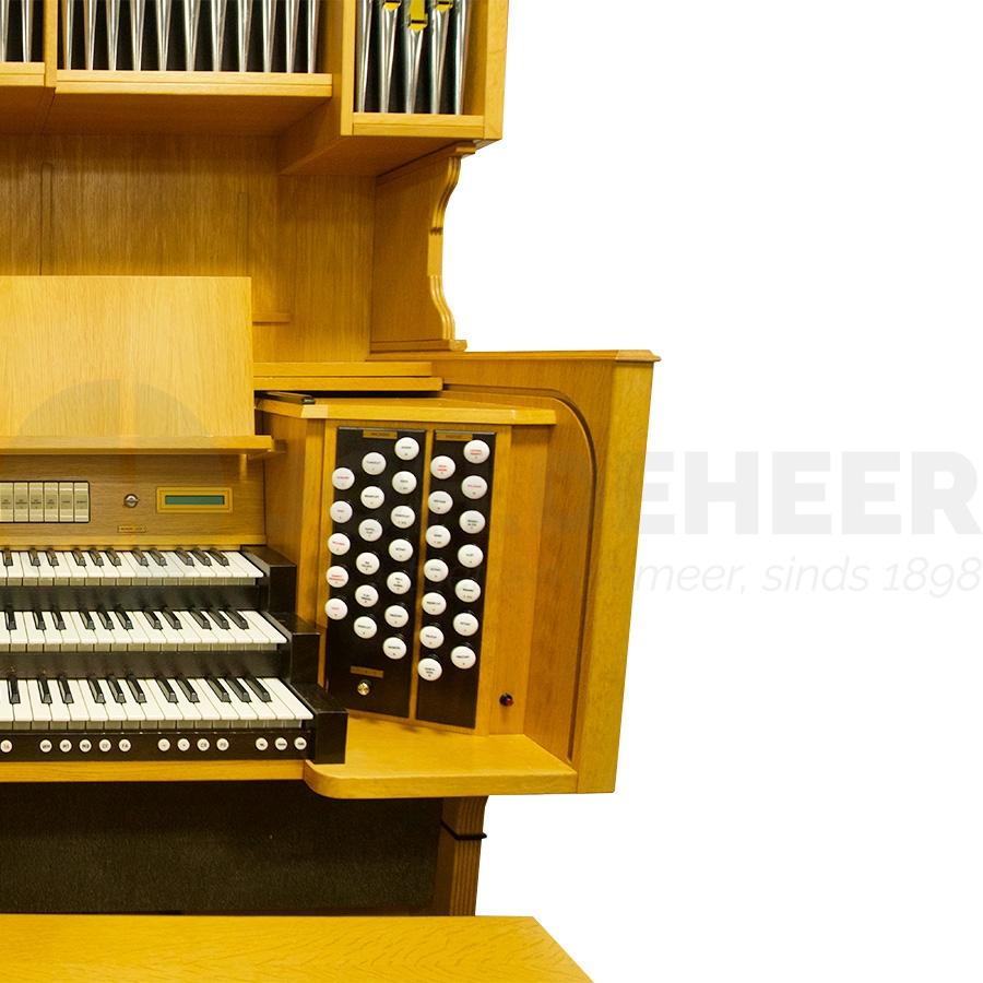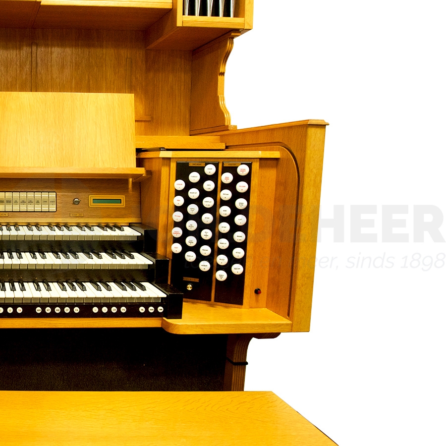 Het orgel heeft een blank eiken afwerking, wat een klassieke en tijdloze uitstraling geeft aan het instrument. De houtbewerking en het materiaal dragen bij aan de algehele esthetiek en duurzaamheid van het orgel.