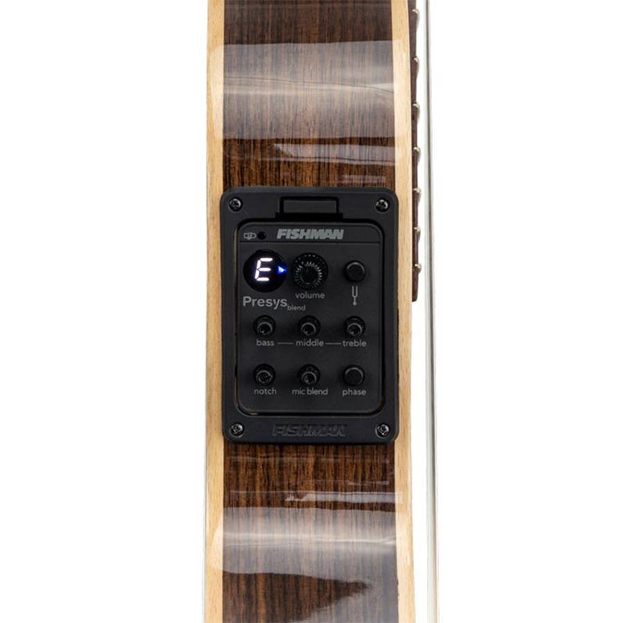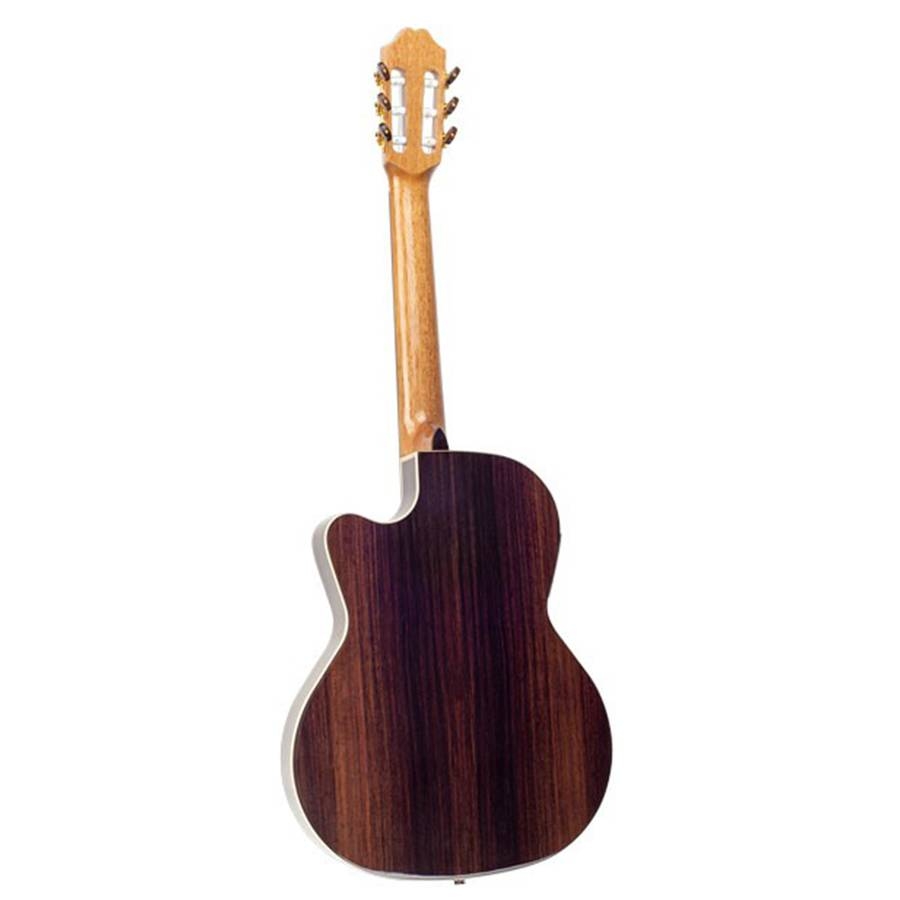 De Juan Salvador 2T is een thinline body gitaar speciaal gemaakt voor live optredens. De dunnere klankkast van de 2T zorgt ervoor dat u minder snel feedback krijgt en het speelt ook nog eens een stuk comfortabeler. Dit is zeer handig voor op het podium, en voor studio gebruik. De 2T bestaat uit een massief sparrenhouten top, en palissander zij- en massieve achterkant. Met deze combinatie houtsoorten krijgt u ondanks de dunne kast een zeer vol en gedetailleerd geluid uit de gitaar. Juan Salvador heeft ook niet bezuinigt in het pickup systeem. Hij heeft namelijk de Fishman Presis Pro Blend waarmee u nauwkeurig de sound kunt mee intstellen. De 2T heeft daarnaast een speciale dunne nek zodat spelers met wat kleinere handen ook comfortabel kunnen spelen. Kortom: Een uitstekende thinline body klassieke gitaar voor een kleine prijs.