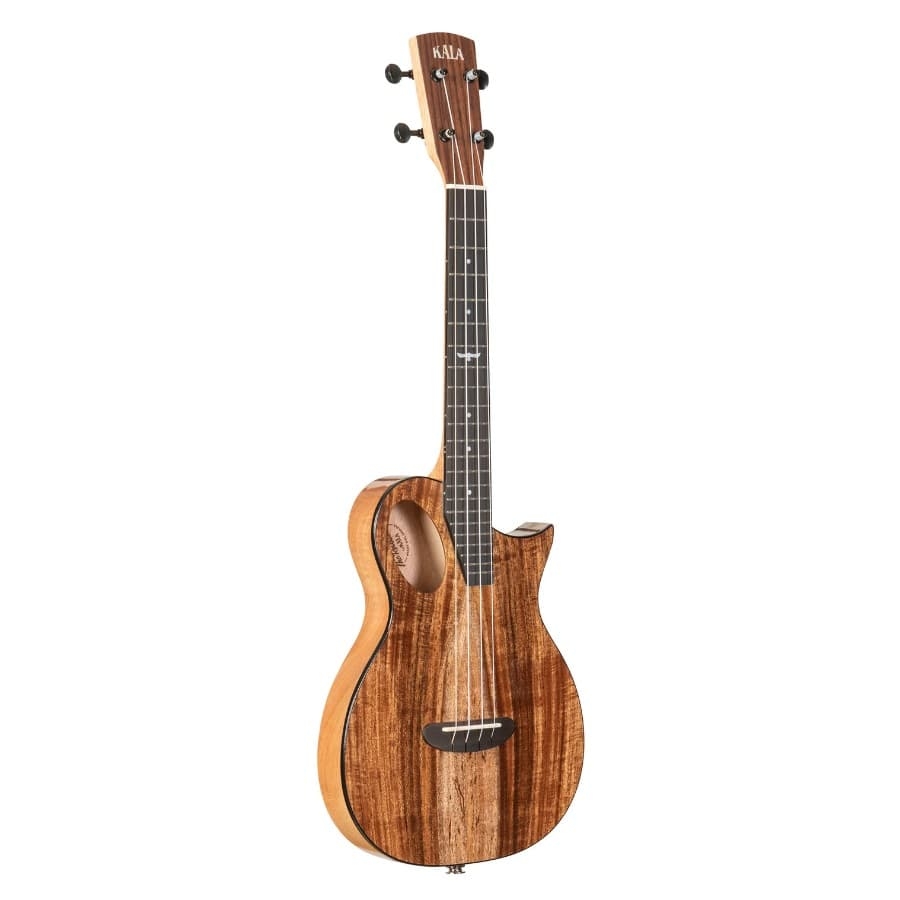 De KA-OWL-ACA-TE is een fijne elektroakoestische ukelele van Kala. De ukelele heeft een prachtige vorm geïnspireerd door het werk van luthier Pete Howlett. De ukelele heeft een nauwe klankkast maar produceert nog steeds een krachtig geluid. Het idee achter een elektroakoestische ukelele is dat deze beide als elektrische en als akoestische ukelele gebruikt kan worden. Voor het akoestische gedeelte is er een opvallend aspect aan deze ukelele: het klankgat zit niet direct onder de snaren maar bevind zich daar schuin tegenover. Op deze manier worden de trillingen van de snaren opgevangen door het massief acacia bovenblad waarna het in het klankgat valt. Dit zorgt voor een betere articulatie en een gedetailleerdere toon. De achter- en zijkanten van de ukelele zijn van okoume gemaakt wat voor een geweldige resonantie en een helder geluid zorgt.