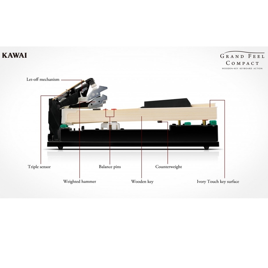 Naast dat deze piano veelvuldig door ervaren volwassen spelers gebruikt zal worden, is deze ook erg geschikt voor kinderen. Het klavier heeft namelijk een “Light Touch Curve” mogelijkheid waardoor deze lichter gaat spelen. Voor jonge kinderen die nog niet over voldoende kracht beschikken is dit een ideale uitkomst om in de jonge levensjaren als ervaring als pianist op te doen. Als de functie is uitgeschakeld, voelt het klavier zeer degelijk aan en zullen zelfs kritische pianisten hier goed mee overweg kunnen. De toetsen bestaan volledig uit hout en dankzij meer dan 90 jaar ervaring lukt het Kawai om een klavier met een uitzonderlijk realistisch gevoel te maken. De witte toetsen zijn voorzien van een synthetisch ivoren bovenlaag. Het “Grand Feel Compact Klavier” heeft gegradueerde gewogen hamers, contragewichten in het basbereik en een drukpuntsimulatie. Daarnaast zorgt het drievoudige sensorsysteem voor optimale herhaling en spelcontrole.