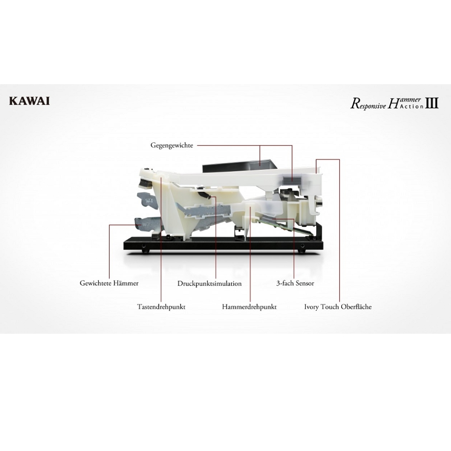 Elke toets die u aanslaat op de Kawai CN-39 wordt zeer nauwkeurig waargenomen. Drie sensoren per toets registreren de diepte en de snelheid waarmee een toets wordt ingedrukt en elke afzonderlijke toets heeft een individueel gegradueerde hamer, die steeds zwaarder worden oplopend van de discant naar de bas. De opleg van de toetsen is van een synthetisch ivoor dat zorgt voor een vocht absorberende werking. Dit maakt dat het klavier authentiek aanvoelt en zijn grip behoudt. Als pianist zult u perfecte controle over het klavier ervaren bij het spelen op de CN-39.