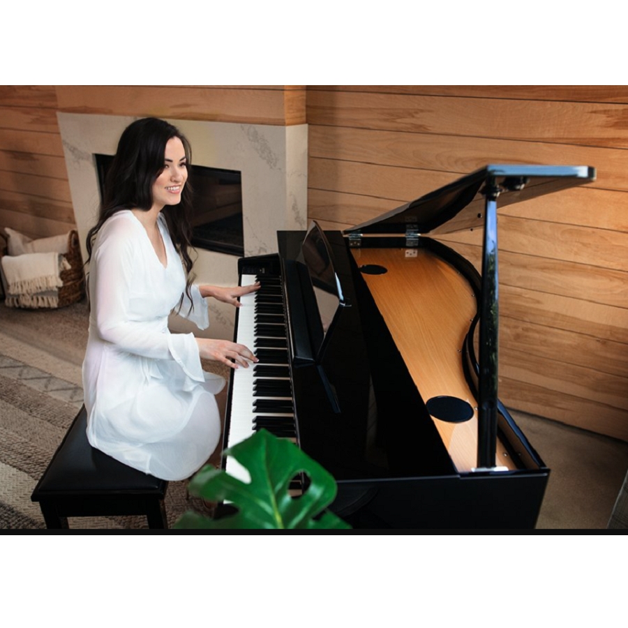 De Kawai DG-30 digitale vleugel is een instrument dat een grootse indruk achterlaat als u hem voor het eerst ziet. Dit nieuwe model combineert de klasse van Kawai’s hoogwaardige geluidstechnologieën en authentieke pianoklavier met een modern vormgegeven baby vleugel model dat elegantie en sierlijkheid uitstraalt. Het compacte formaat van de DG-30 zorgt dat het instrument niet al te veel ruimte inneemt terwijl de hoogglans zwarte afwerking en eigentijdse uitstraling een verrijking voor uw interieur zijn.