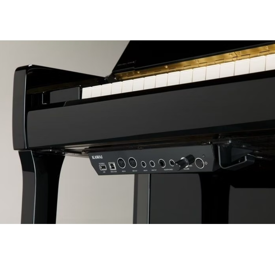 De bediening van het elektronische gedeelte vindt plaats via de “Piano Remote App”. In deze overzichtelijke app kunt u een overzicht vinden van alle klanken en eenvoudig instellingen wijzigingen. Ook een opnamefunctionaliteit vindt u in deze app. Links onder het klavier bevindt zich een kastje met daarop diverse aansluitingen. Zo kunt u hier twee hoofdtelefoons gelijktijdig aansluiten. Via de USB aansluiting is het mogelijk om de piano met de computer te verbinden en zo midi gegevens uit te wisselen. Ook een USB-Stick kan worden ingeprikt om songs direct op het instrument af te spelen of uw eigen spel in MP3 of WAV-formaat op te slaan.