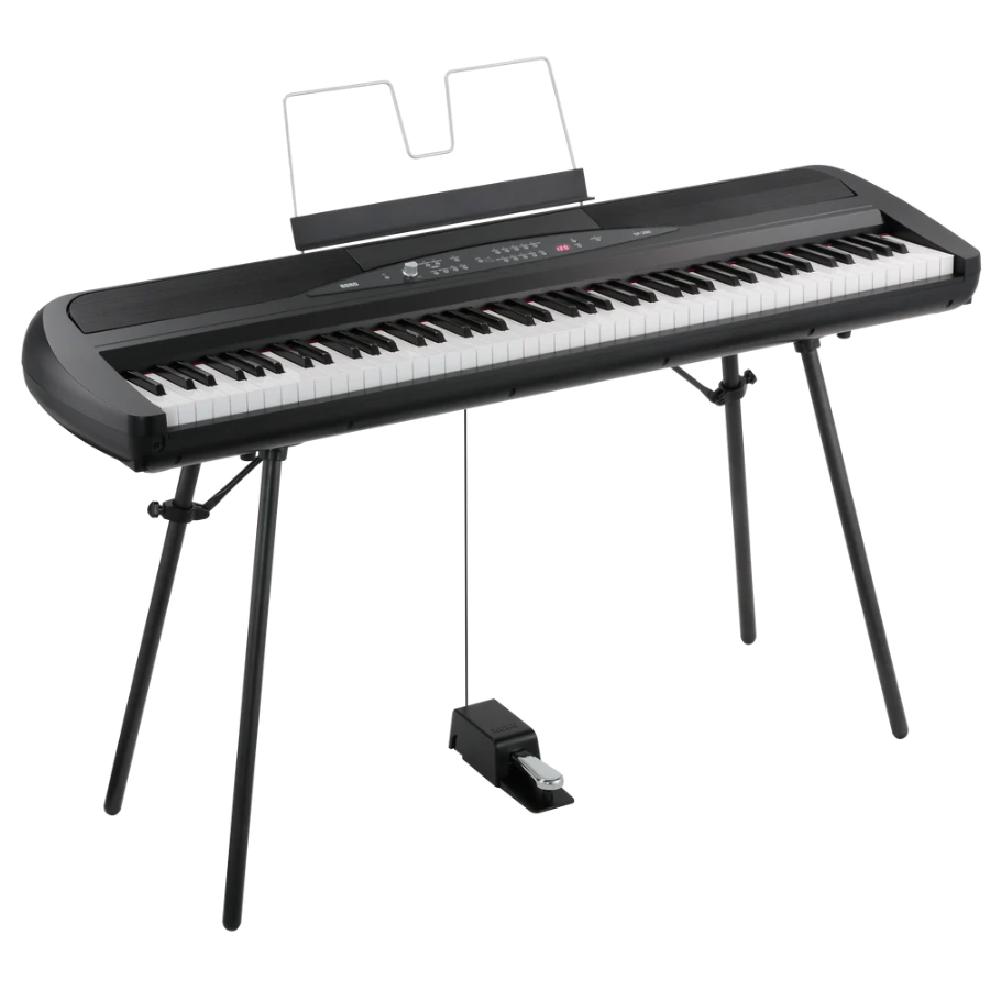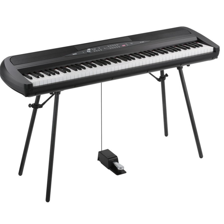 De Korg SP-280 wordt geleverd met een stevige stand, een bijpassende lessenaar voor bladmuziek, een demperpedaal en een AC-adapter. Daarmee kunt u de piano direct installeren en bespelen zodra hij uit de doos komt.