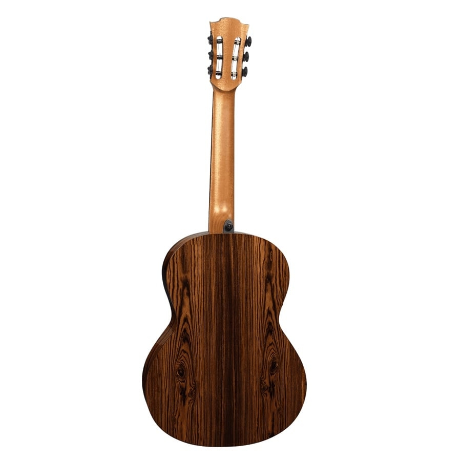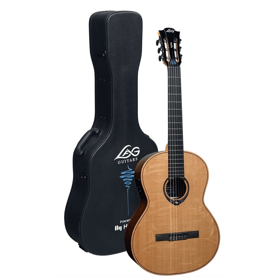 Het innovatieve Franse merk Lâg was één van de eerste die Smart Guitars op de markt bracht. Ze noemen dit de HyVibe serie, waarvan dit model de HyVibe 30 Classic is. Dit is dus een klassieke slimme gitaar. De gitaar ziet er uit als een standaard klassieke gitaar, echter zit er veel achter dit normale uiterlijk. Ten eerste is de gitaar natuurlijk semi-akoestisch, wat betekent dat deze op een versterker of pa-systeem aangesloten kan worden via de input aan de onderkant. Verder heeft de gitaar een ingebouwde speaker met effecten. Dit betekent dat de gitaar versterkt gebruikt kan worden zonder externe geluidbronnen als versterkers of kabels. Dit zorgt er ook voor dat u dus effecten kan toevoegen op het akoestische geluid zoals reverb, chorus, delay, octaver, tremelo, etc. De speaker kan ook als externe speaker gebruikt worden. Dit betekent dat u via Bluetooth een apparaat op de gitaar kan aansluiten en deze als Bluetooth-speaker kan gebruiken. U kunt echter ook tegelijkertijd met uw favoriete muziek meespelen. De ingebouwde batterij heeft een lange levensduur en de gitaar geeft het percentage van de batterij aan waardoor u op tijd met de bijgeleverde adapter de gitaar kan opladen.