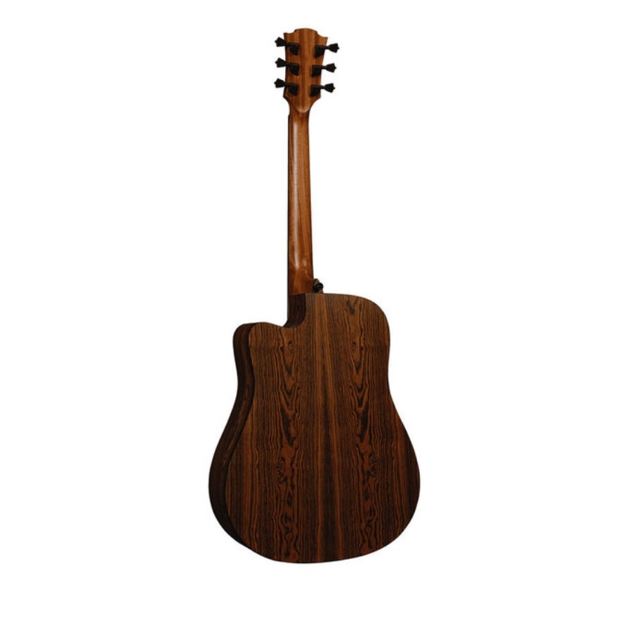 De T270DCE is een hoogwaardige en veelzijdige dreadnought westerngitaar van Lag. Lag is een Frans bedrijf wat vele soorten gitaren aanbiedt die allemaal over goede prijs/kwaliteitverhoudingen beschikken. De T270DCE is onderdeel van Lag’s Tramontane serie, waarmee ze proberen om moderne modellen te maken volgens authentieke Franse gitaarbouwvaardigheden. Dit model is een dreadnought, wat betekend dat het een ultieme slaggitaar is. Dreadnoughts beschikken over een klankkast die groot genoeg is voor een goede resonantie en een rijk geluid, maar klein genoeg om nog comfortabel vast te houden. De T270DCE is ook semi-elektrisch, wat betekend dat deze akoestische gitaar ook te versterken is. De gitaar beschikt over Fishman Ink 3 elektronica, wat hoogwaardige elektronica is die het geluid zo authentiek mogelijk vertaald richting de versterker. Het bovenblad van de gitaar is van sparrenhout gemaakt. Dit zorgt voor een warm geluid. De achter- en zijkanten zijn van snakewood gemaakt. Dit zorgt niet alleen voor een prachtig patroon, maar ook voor een helder geluid. Echter is het uiterlijk ook belangrijk. De snakewood achterkant in combinatie met het lichte sparrenhouten bovenblad geeft de gitaar een professionele en moderne uitstraling, terwijl de donkere accenten en details rond de rozet en de stemknoppen de gitaar een uniek uiterlijk geven. Kortom, een prachtige en goede gitaar voor een kleine prijs!