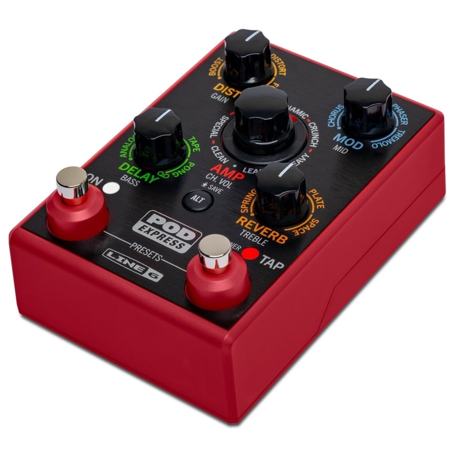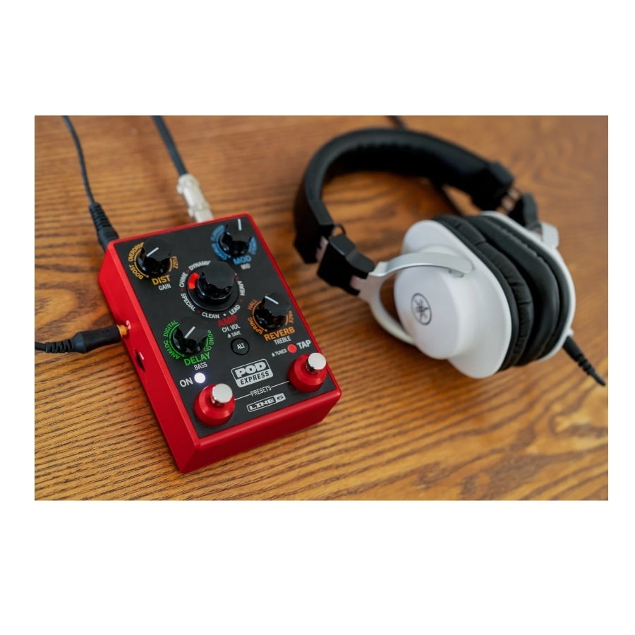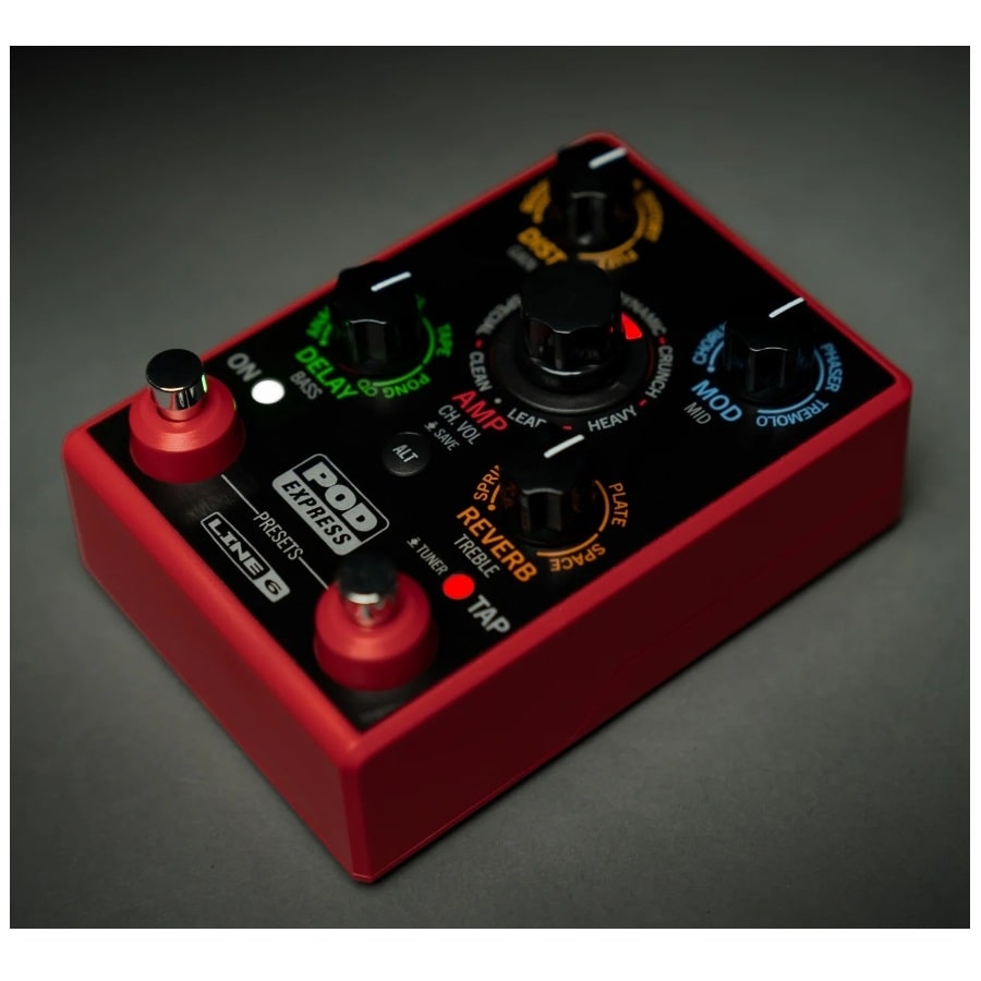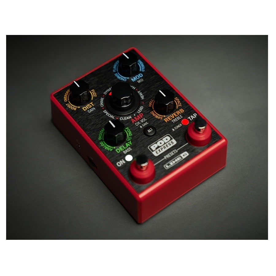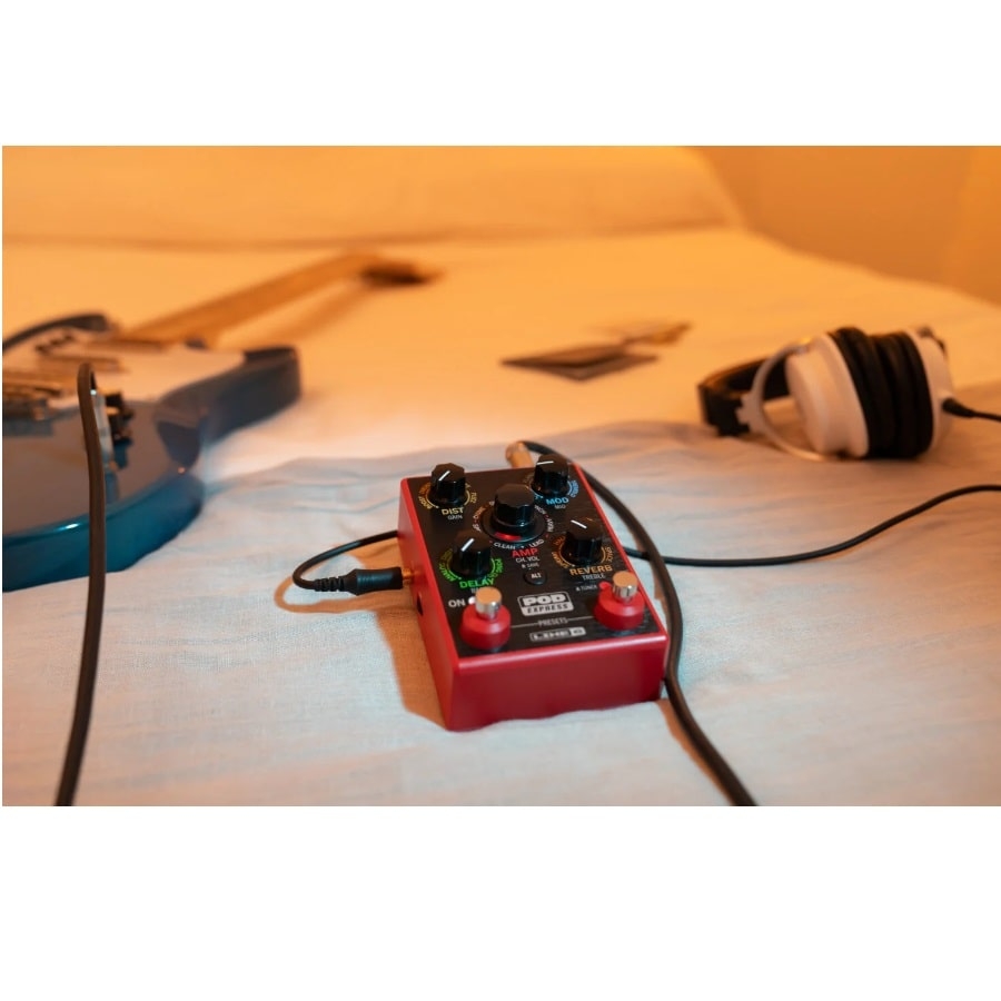 De Pod Express is een handig multi-effectpedaal voor elektrische gitaren. Dit kleine pedaaltje is enorm sterk en bevat vele soorten geluiden. Er zitten vijf grote draaiknoppen op, de middelste is de AMP modelling knop, waarmee u tussen zeven verschillende soorten versterkers kan kiezen. Daarnaast is er ook de DIST-knop, waarmee u tussen vier soorten vervorming kan kiezen, de MOD-knop wat chorus, flanger, phaser en tremolo bevat. Verder is er ook de DELAY-knop en de REVERB-knop zodat u de ultieme ambiance kan creëren. Zodoende heeft u toegang tot alle belangrijke effecten voor uw gitaar. Met de Pod Express heeft u geen pedalboard meer nodig want het pedaal bevat alles, zelfs een ingebouwd stemapparaat. Bovendien heeft u geen USB-interface nodig als u wilt opnemen, want de Pod Express heeft een USB-C aansluiting waarmee u deze direct op uw laptop of PC aan kan sluiten en kan opnemen en een hoofdtelefoonaansluiting voor het monitoren.