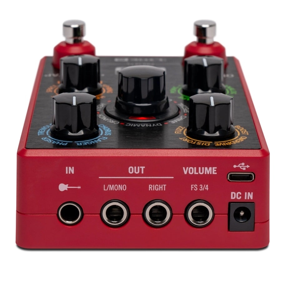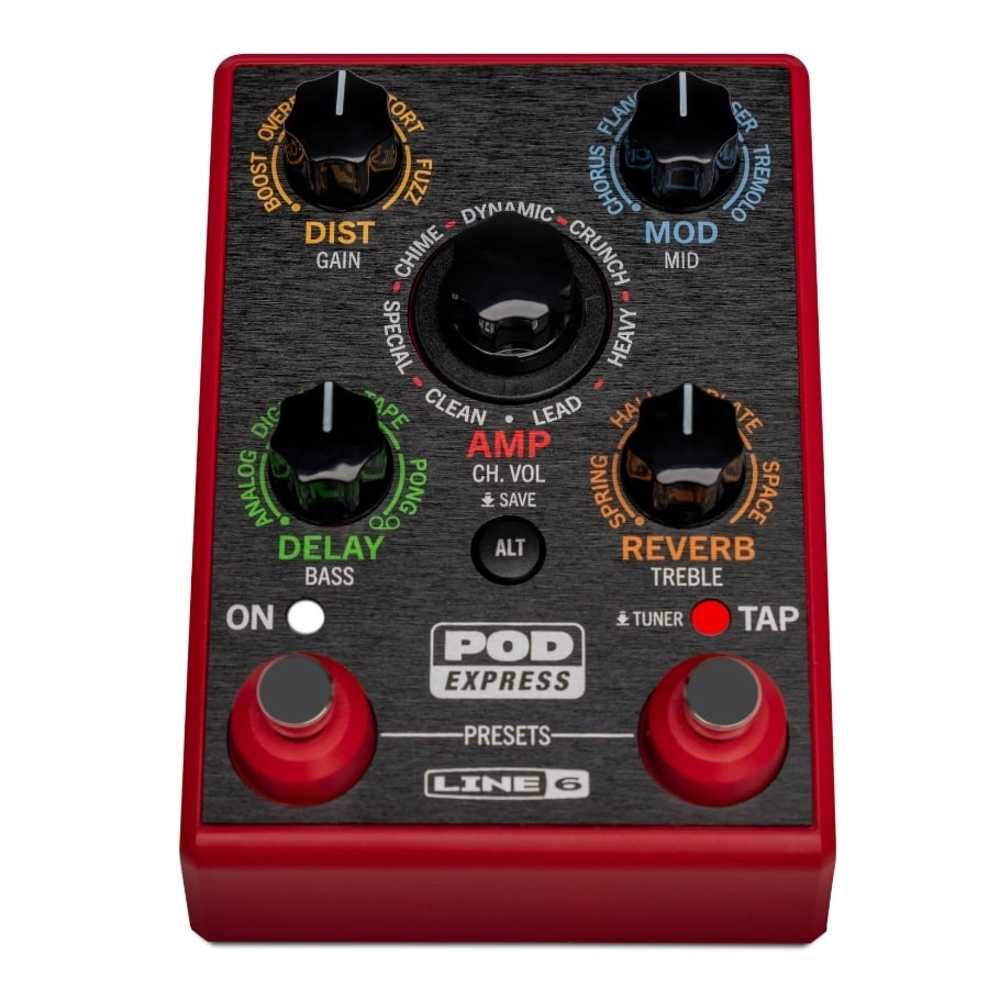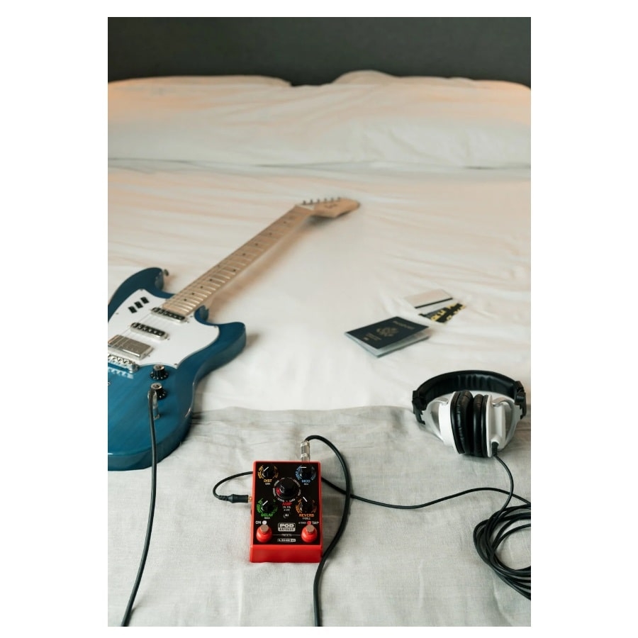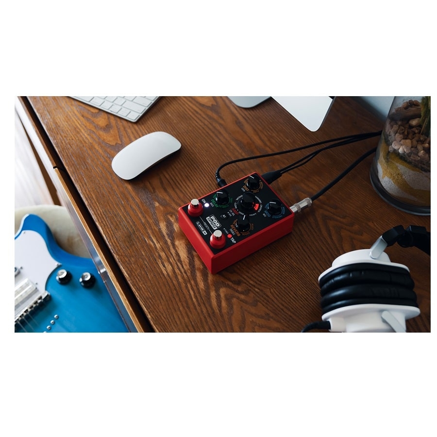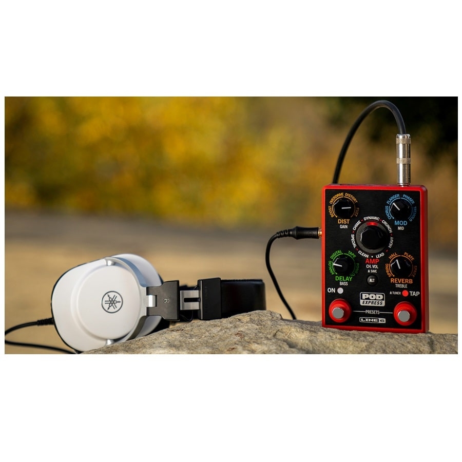De Pod Express is een handig multi-effectpedaal voor elektrische gitaren. Dit kleine pedaaltje is enorm sterk en bevat vele soorten geluiden. Er zitten vijf grote draaiknoppen op, de middelste is de AMP modelling knop, waarmee u tussen zeven verschillende soorten versterkers kan kiezen. Daarnaast is er ook de DIST-knop, waarmee u tussen vier soorten vervorming kan kiezen, de MOD-knop wat chorus, flanger, phaser en tremolo bevat. Verder is er ook de DELAY-knop en de REVERB-knop zodat u de ultieme ambiance kan creëren. Zodoende heeft u toegang tot alle belangrijke effecten voor uw gitaar. Met de Pod Express heeft u geen pedalboard meer nodig want het pedaal bevat alles, zelfs een ingebouwd stemapparaat. Bovendien heeft u geen USB-interface nodig als u wilt opnemen, want de Pod Express heeft een USB-C aansluiting waarmee u deze direct op uw laptop of PC aan kan sluiten en kan opnemen en een hoofdtelefoonaansluiting voor het monitoren.